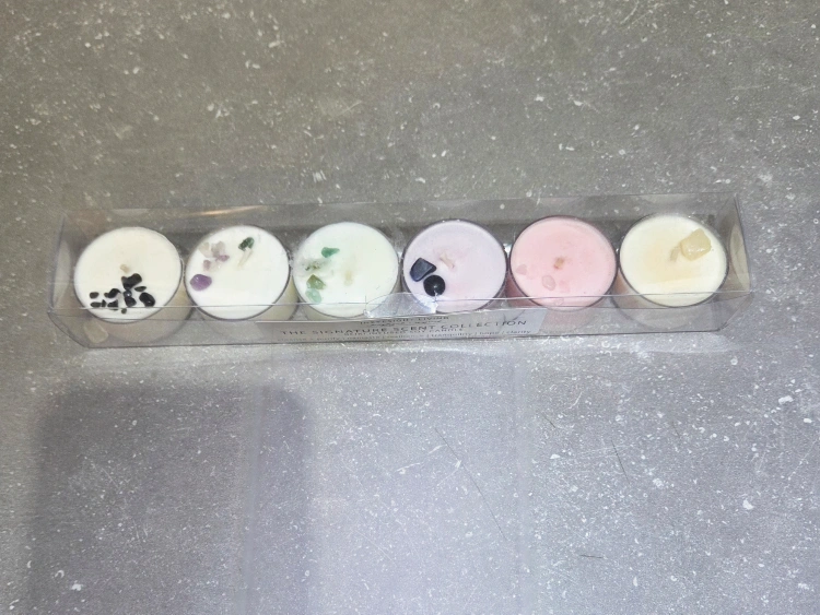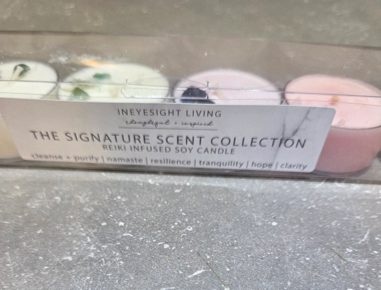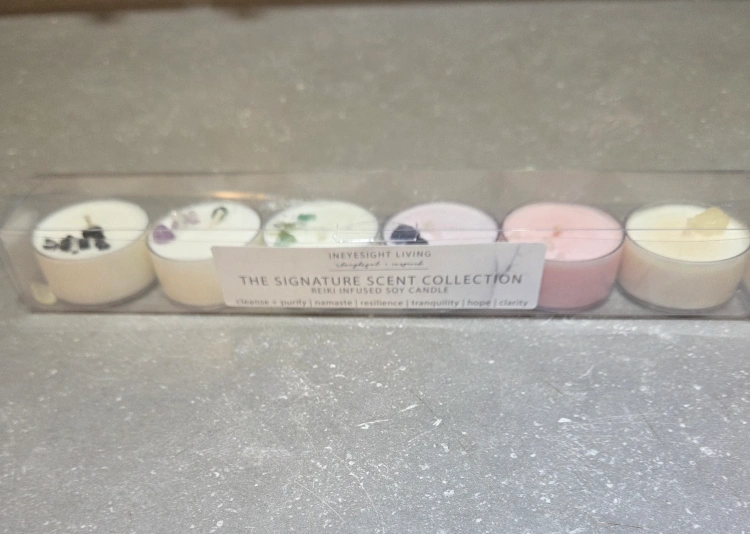 15Selling a set of New Ineyesight Living Signature Scent Collection Reiki Infused Soy Candles! These tea light candles are perfect for creating a calming atmosphere with scents like cleanse, purify, namaste, resilience, tranquility, hope, and clarity Each tea light contains corresponding gem stones in the wax