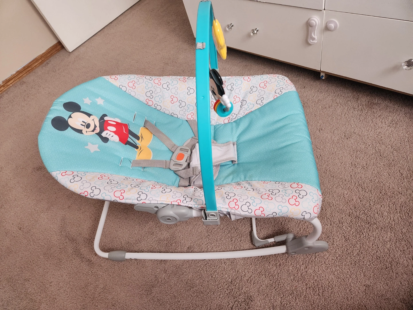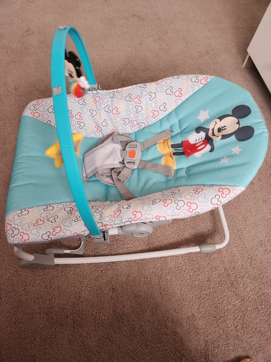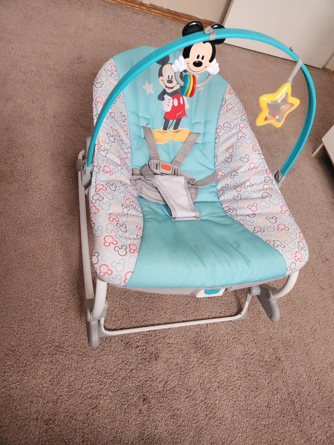15Adorable baby rocker, Mickey Mouse theme. Features a teal fabric seat with Mickey Mouse images, and a detachable toy bar. Suitable for infants. Gently used.