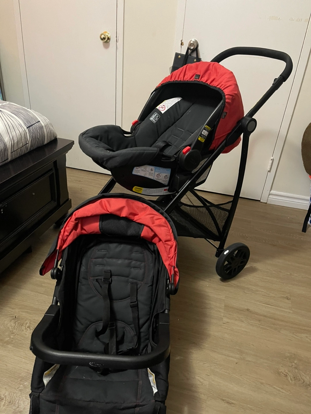 83Graco travel system. Includes infant car seat and stroller. Black and red colour scheme. Stroller folds compactly. Good condition. Suitable for infants and toddlers.