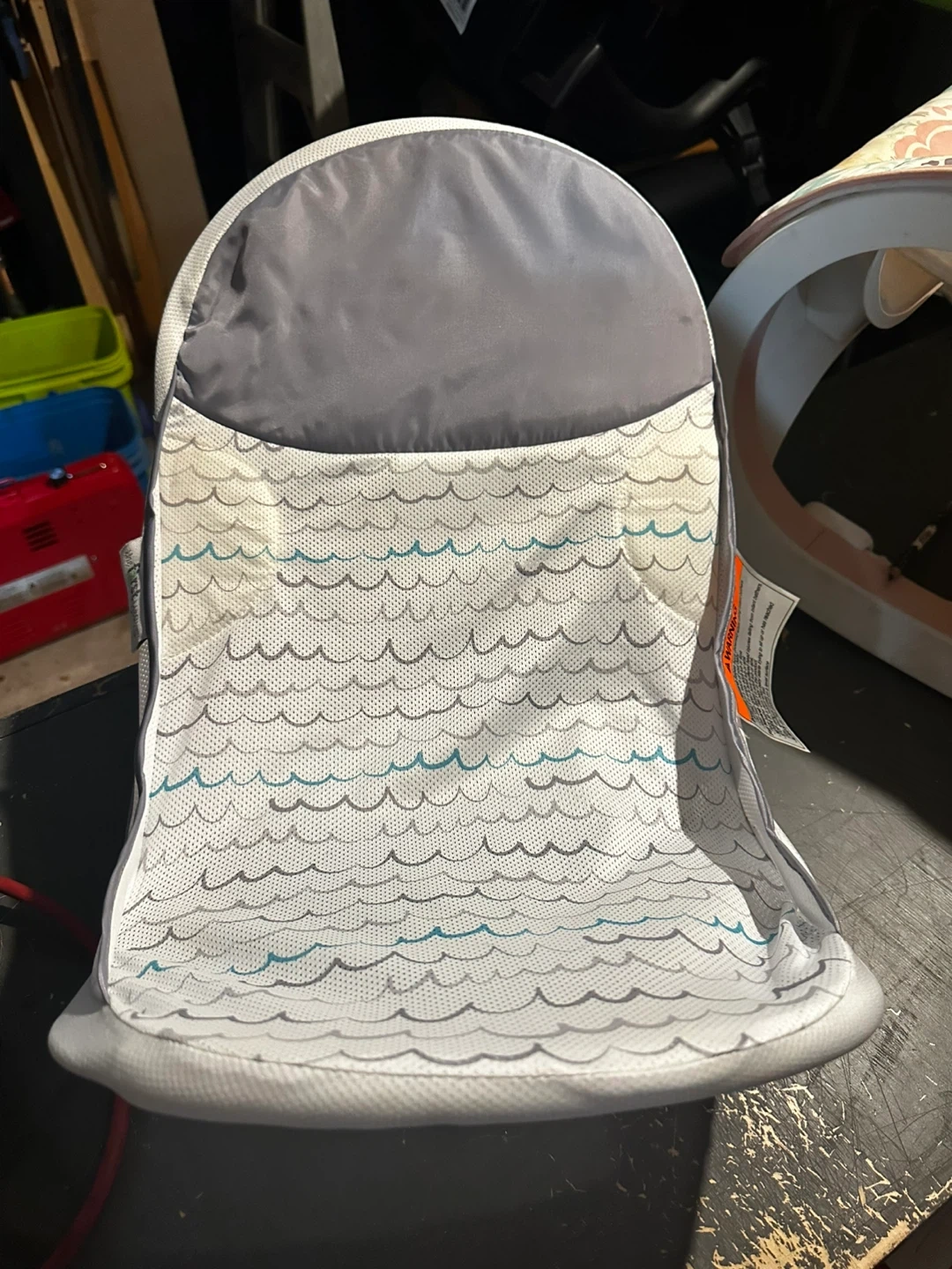 Infantino bath seat (foldable for travel) in good condition. Never used .It features a grey and white wave pattern with light blue accents. Perfect for keeping your little one comfy!