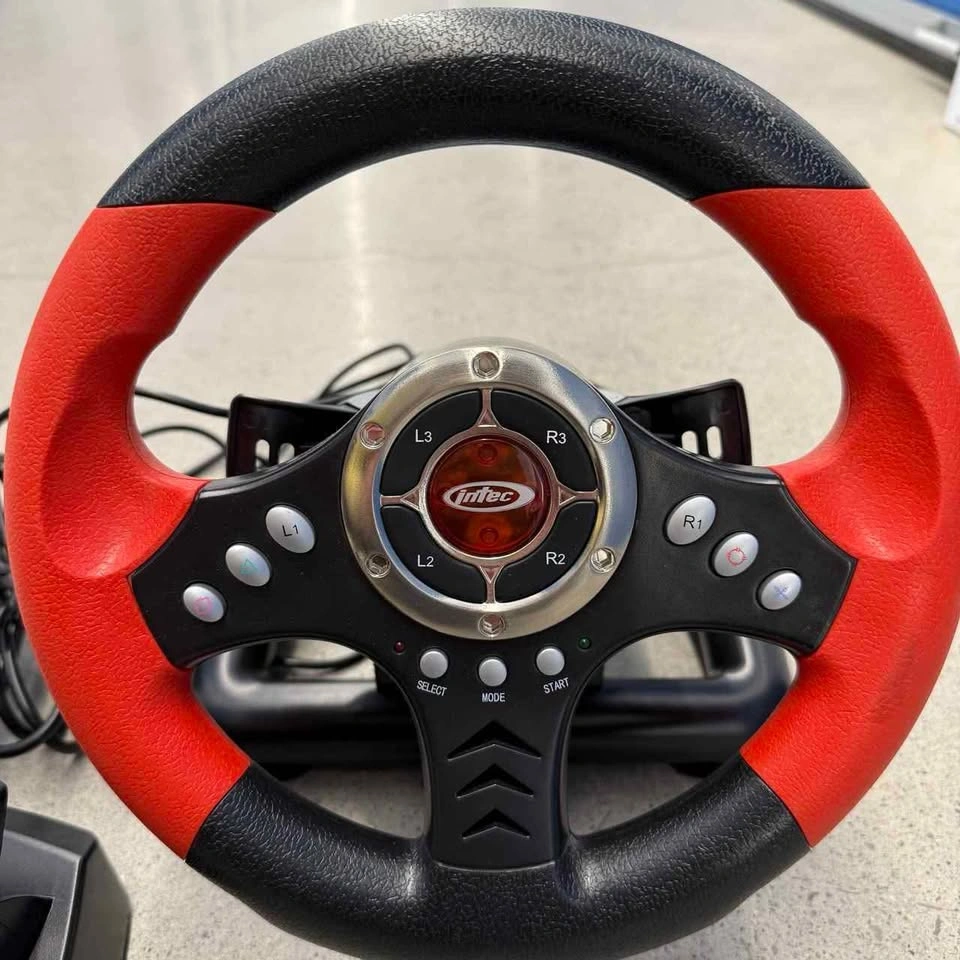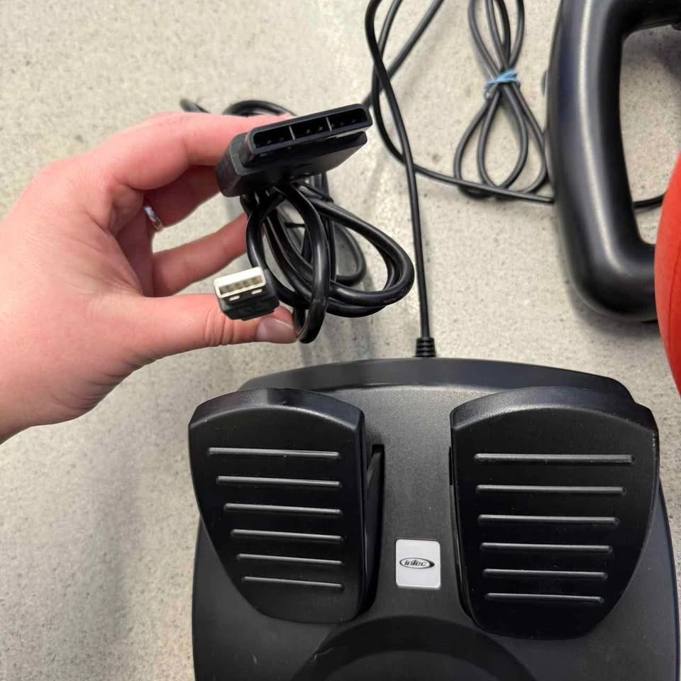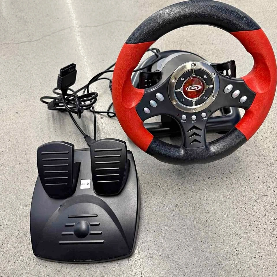 146Racing wheel and pedal set. Compatible with Playstation 2. Red and black. Includes all cords and components.