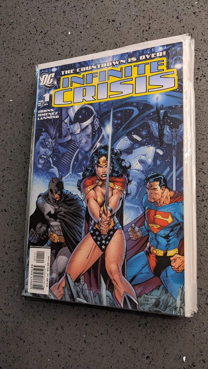 735Infinite Crisis (2005) Issues #1-7 + Prelude Issue "Cover by Jim Lee - Written by Geoff Johns Art by Phil Jimenez & Andy Lanning Covers by Jim Lee & Sandra Hope and George Pérez. It's finally here: the comics event so massive that it built over the first half of 2005, through COUNTDOWN, DAY OF VENGEANCE, RANN/THANAGAR WAR, VILLAINS UNITED and THE OMAC PROJECT! Prepare for the dawn of the DCU's darkest day in INFINITE CRISIS, a 7-issue miniseries written by Geoff Johns (GREEN LANTERN, JSA) with art by Phil Jimenez (OTHERWORLD, Uncanny X-Men) & Andy Lanning (OTHERWORLD) and covers by George Pérez (CRISIS ON INFINITE EARTHS) and Jim Lee (BATMAN, SUPERMAN) & Sandra hope! Surrounded by their most fearsome enemies, the world's greatest heroes are divided within and without. DC's icons ? Superman, Batman, Wonder Woman ? are joined by Nightwing, Supergirl, Donna Troy, Superboy, Robin, Wonder Girl, Green Lantern, the Flash and more as they face their most dire hour. What happens next will destroy friendships and lives, dictating the direction of the universe for the next generation! Years in the making, the greatest event to hit the DCU in over two decades is about to explode ? don't miss out! "
