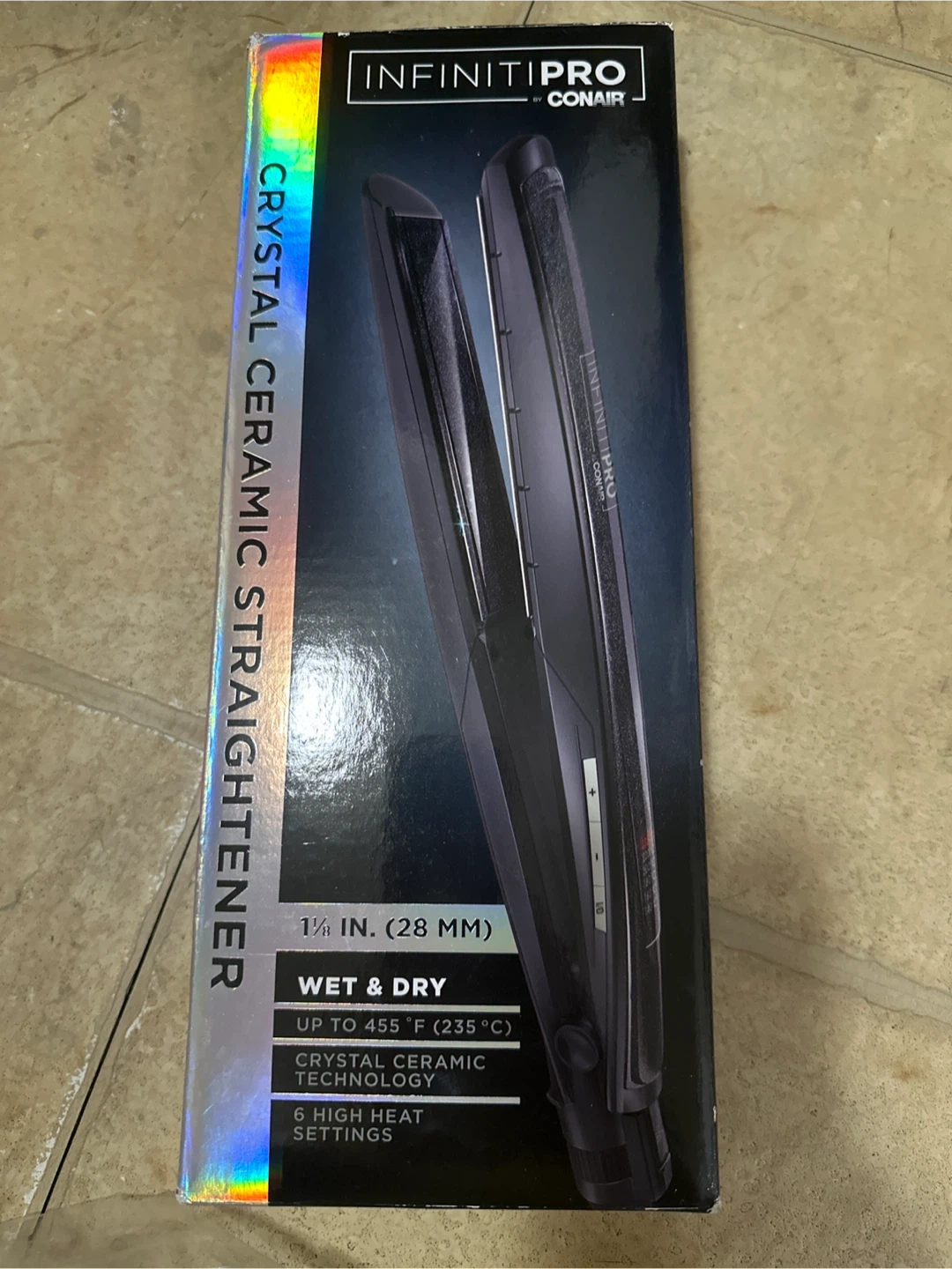 33Selling an INFINITIPRO by Conair Crystal Ceramic Straightener. It features crystal ceramic technology and 6 high heat settings. It's suitable for both wet and dry hair, heating up to 455°F (235°C). The straightener has 1 1/8 in. (28 mm) plates. Box included