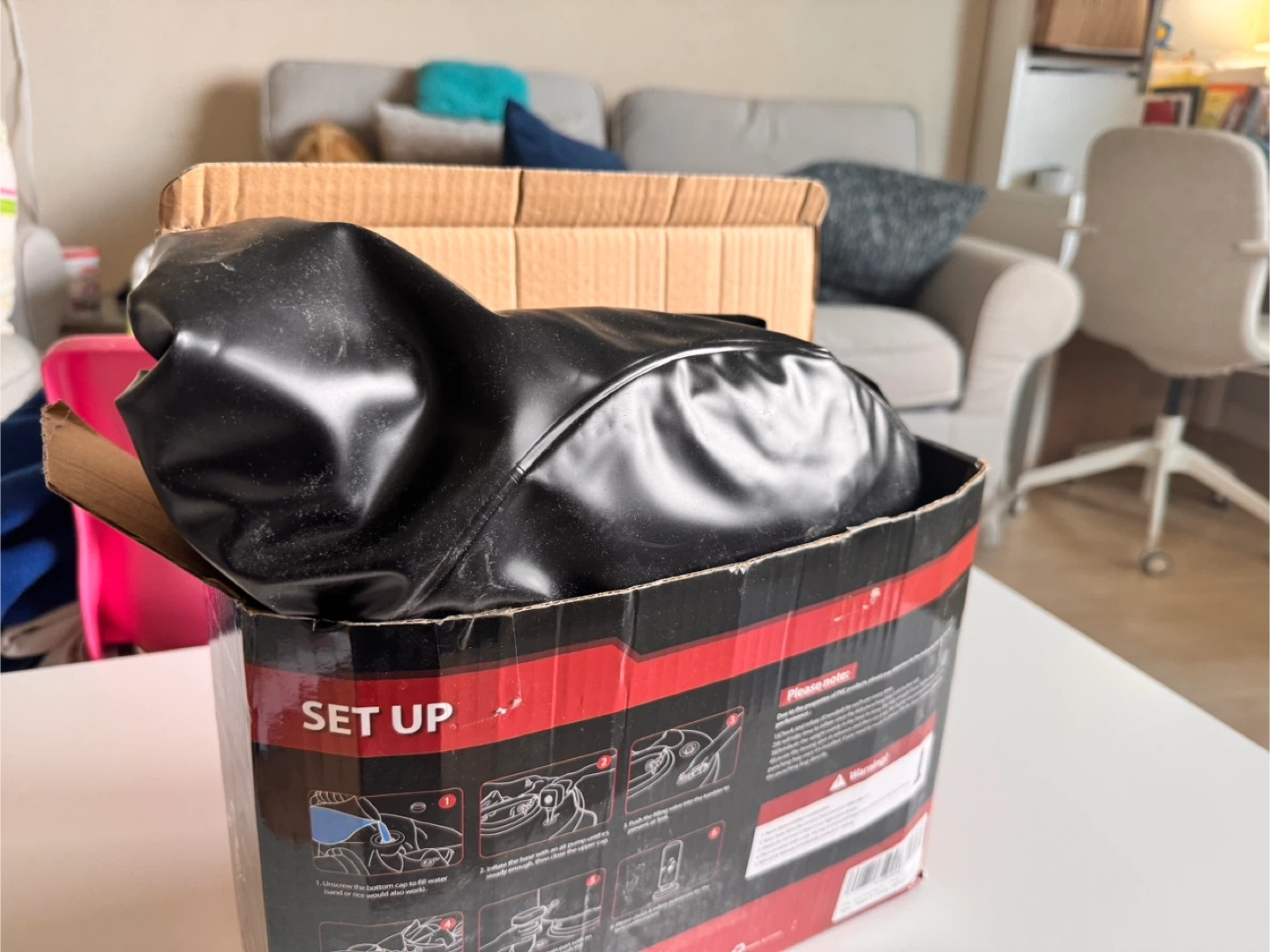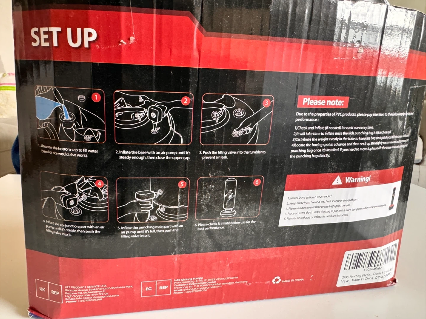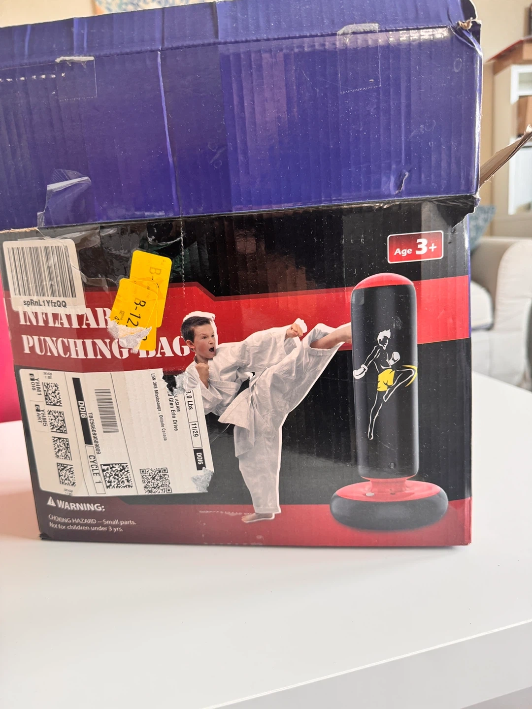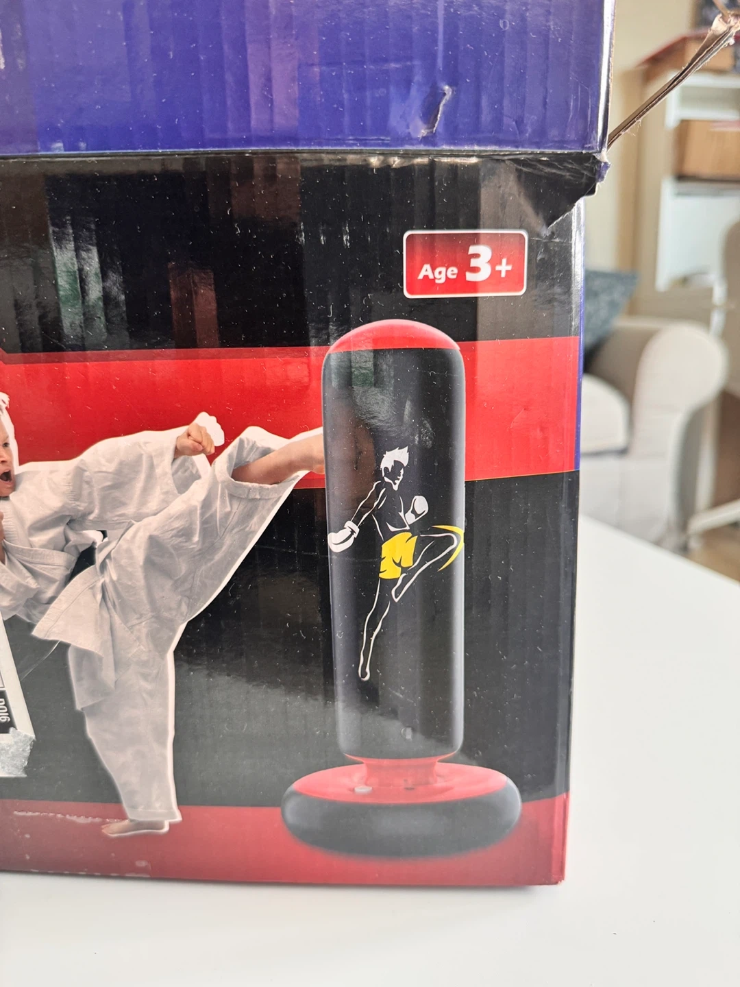 Inflatable punching bag for kids. Recommended for ages 3+. The box shows how to set it up, and it looks like all the parts are included. Great for active play!