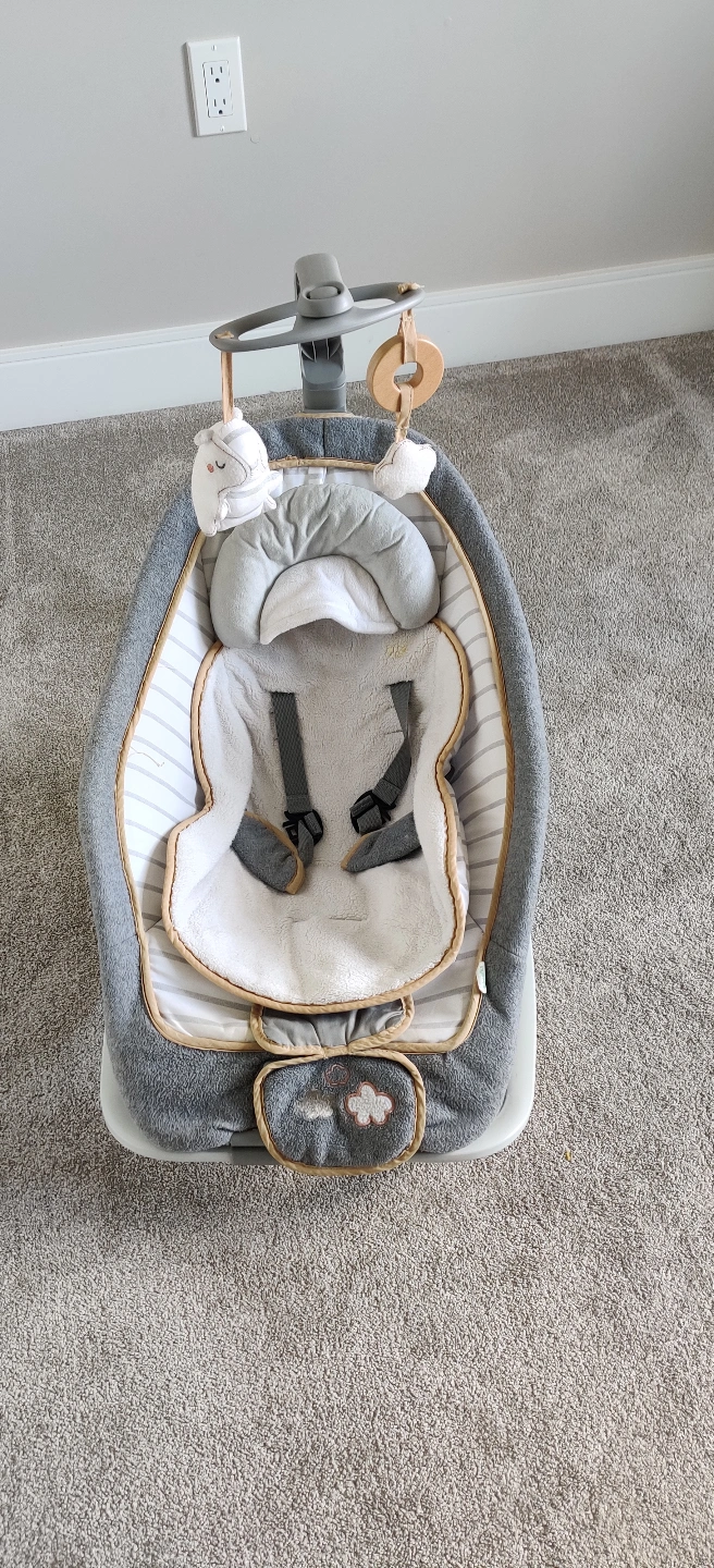 110Grey and beige baby swing. Features include vibration and multiple recline positions. Includes head support and toy bar. Gently used.