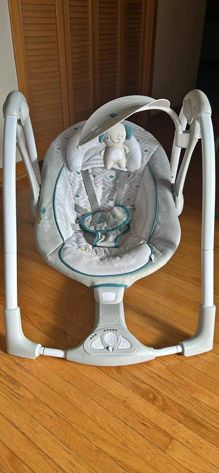 18Ingenuity baby swing. Can vibrate, play music, be set on a timer. Used with my two kids but still works well. Has pillow head rest for smaller babies and 5-pt harness. Takes 4x D batteries for the main swing and I believe C batteries for the vibrating part. Has working batteries in it.