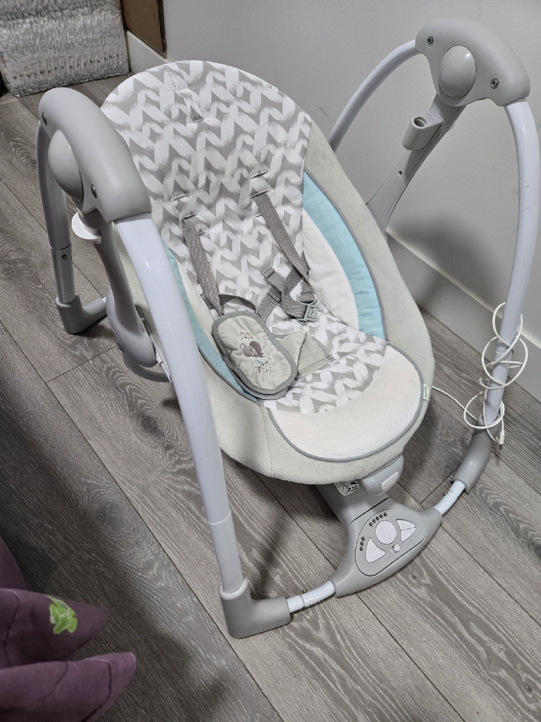10Selling an Ingenuity baby swing in excellent condition! It features a grey and white patterned seat with light blue accents. Perfect for soothing your little one with gentle motion and sounds. The swing is clean and ready for a new home! selling as i need more space in room for my twins to crawl.