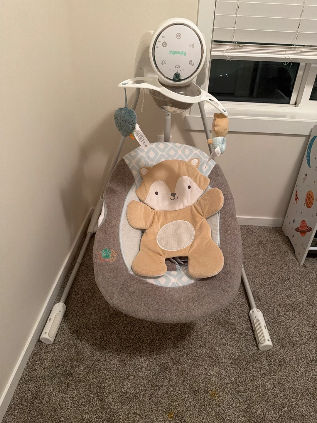 0Selling a gently used Ingenuity baby swing! It features a cute fox design on the seat and looks very comfy for your little one. Great for soothing and entertaining babies. It's in good condition and ready for a new home!