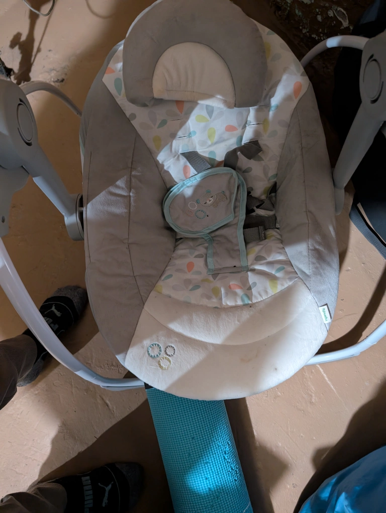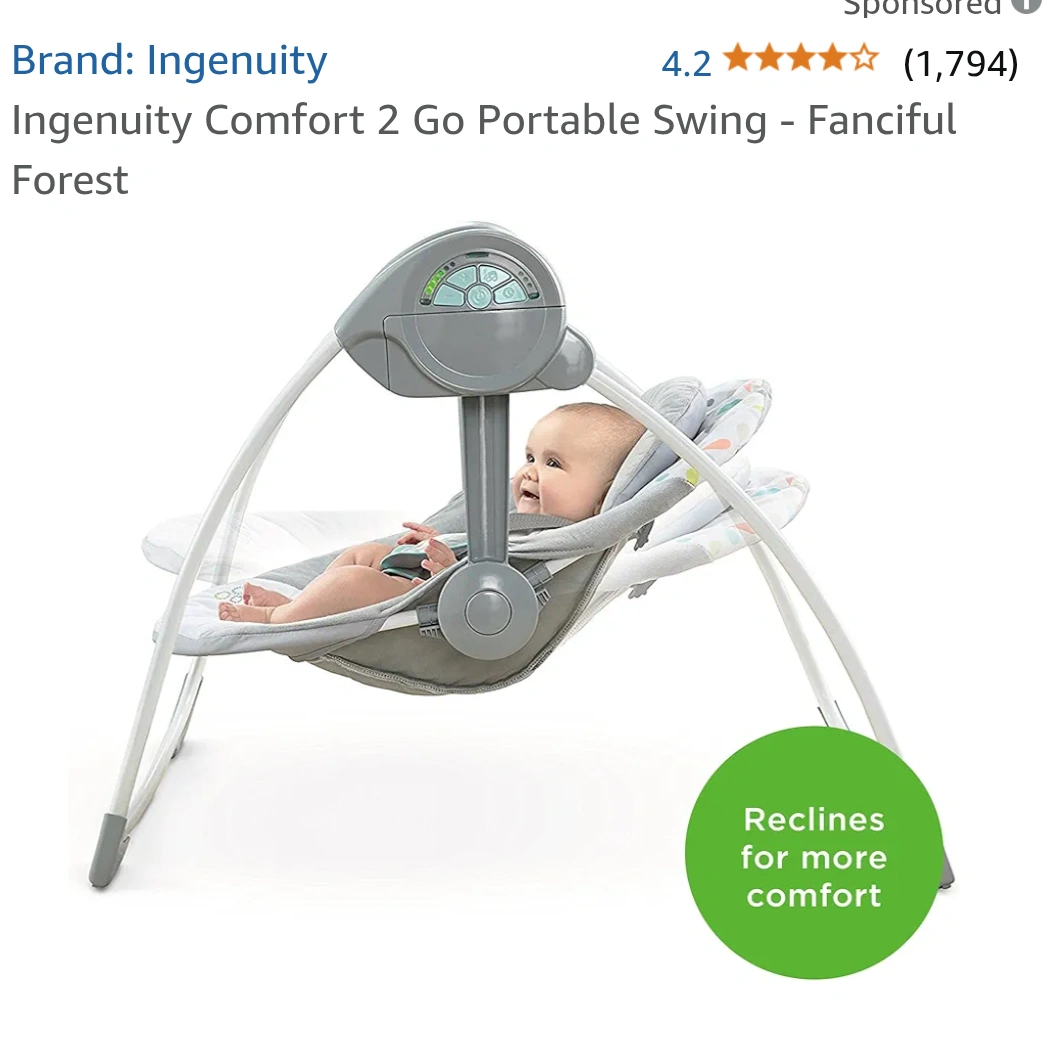 Baby swing, portable and reclines. Grey and teal colour scheme. Features multiple swing speeds and soothing sounds.