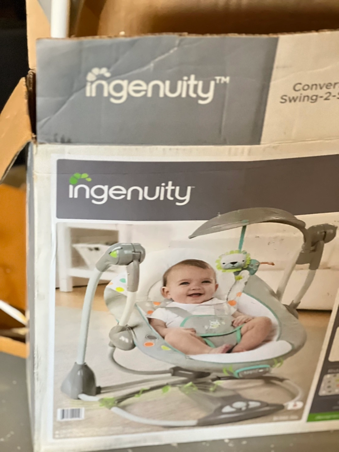 Baby swing and seat. Grey and green colour scheme. Looks gently used. In original box.pick up only