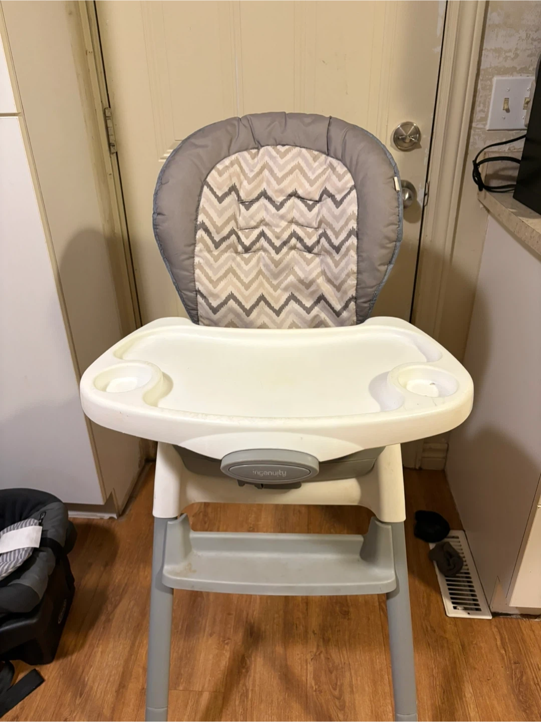 15Here's an Ingenuity high chair in great condition! It's perfect for little ones getting ready to start solids. The seat pad is grey with a fun chevron pattern. It's easy to clean and folds for storage It’s also a 3 in 1 Cash only!
