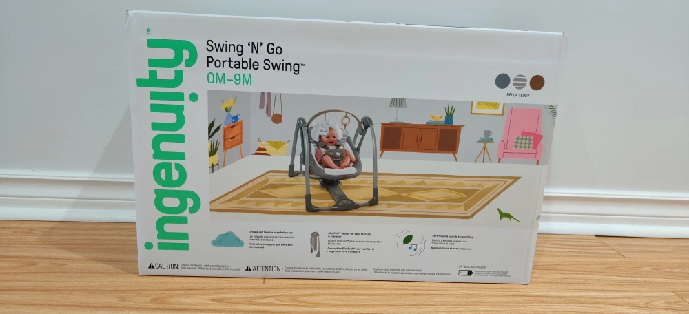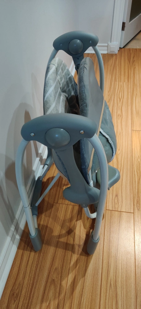 Grey and white swing with five speeds and multiple swing directions. Includes a toy bar with two hanging toys. Folds for easy storage.