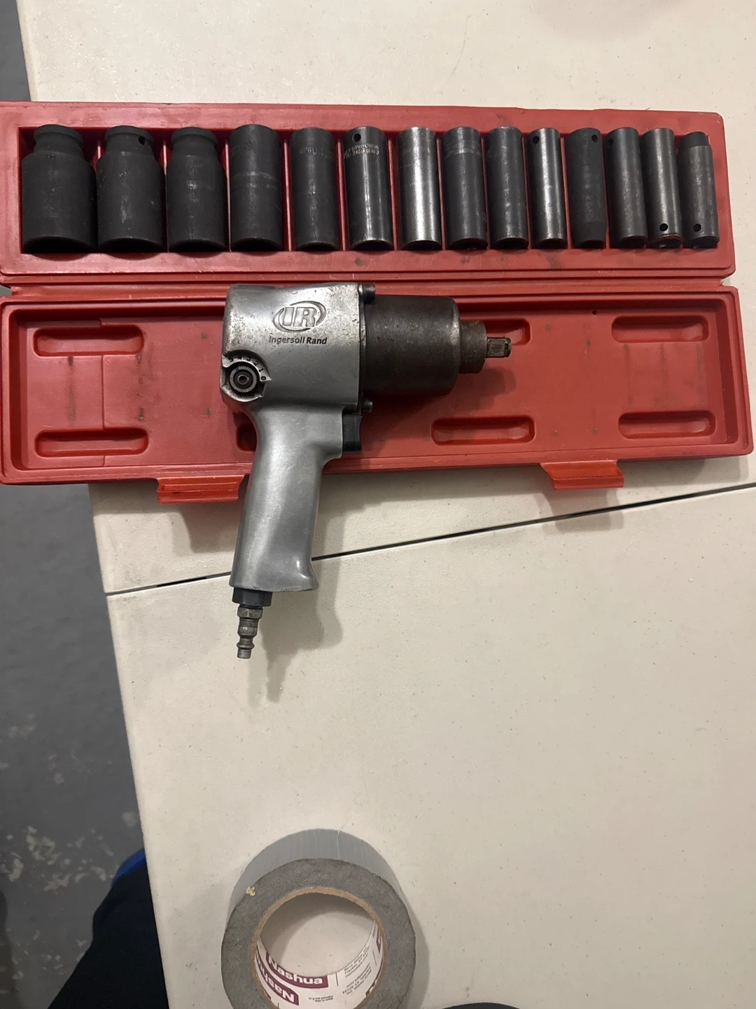 77Selling an Ingersoll Rand 231HA impactool with a 1/2" drive. It operates at PMAX 90 psig / 6.2 bar and 8,000 RPM. Comes with a set of sockets and a case.