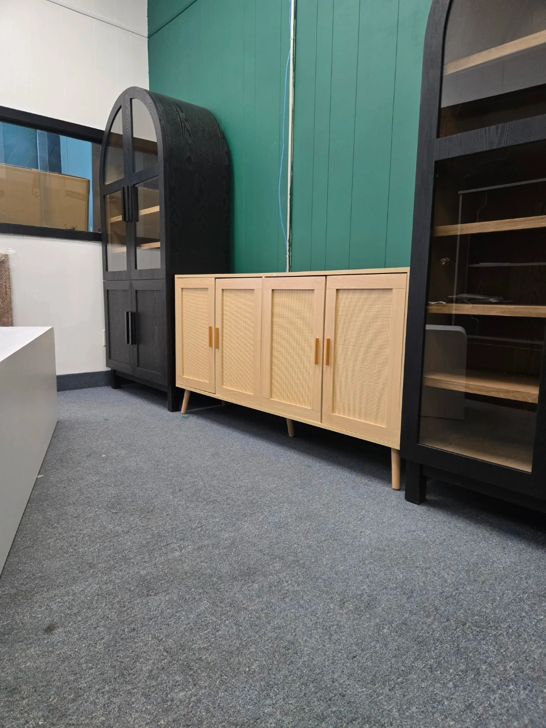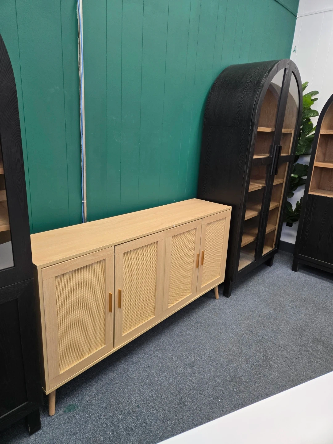 Light Wood 4-Door Sideboard with Rattan Detailing