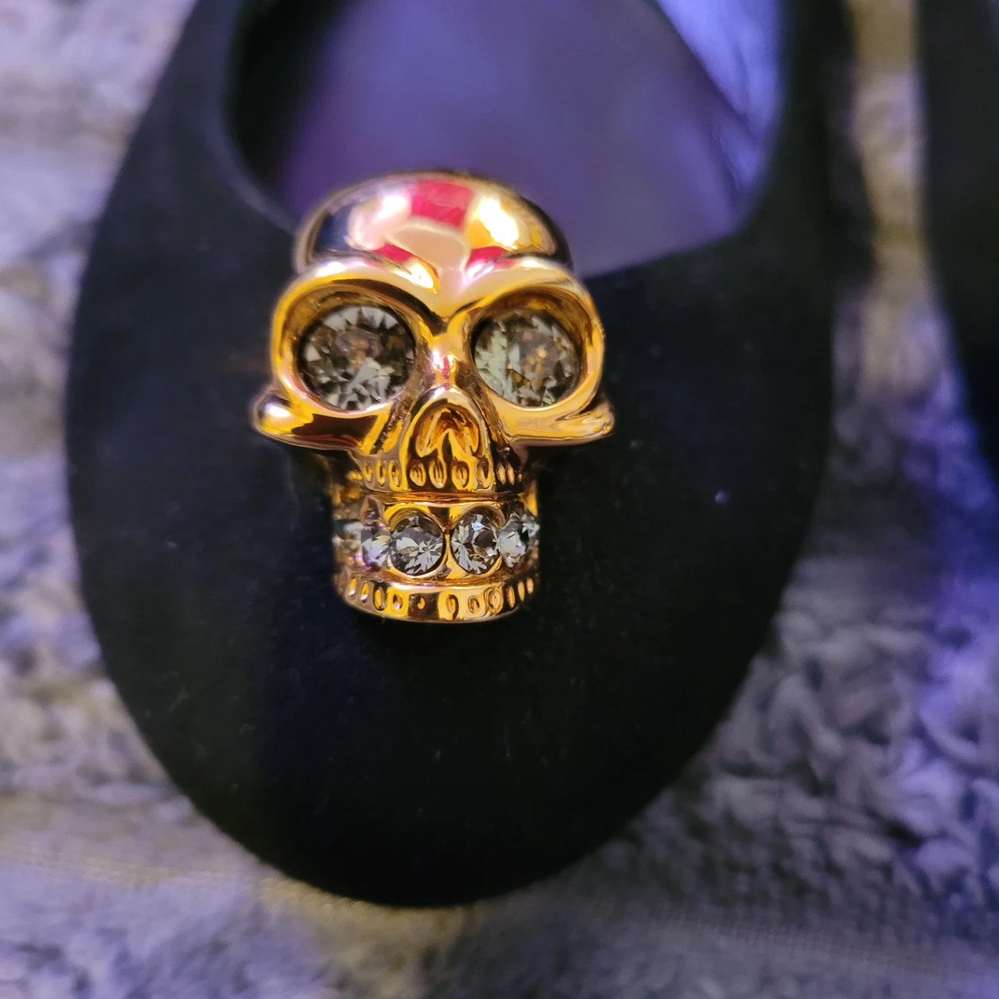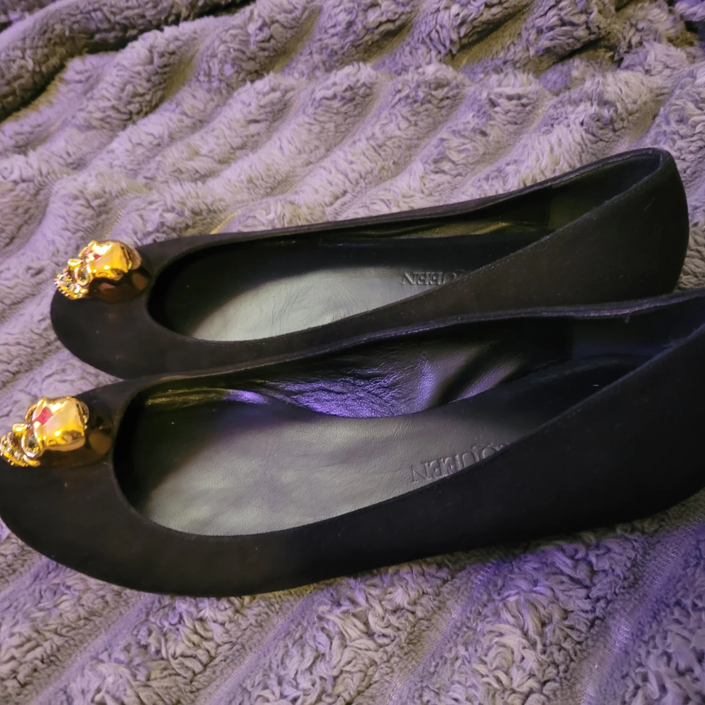 Be edgy and gorgeous with these Alexander McQueen black suede ballet flats. They feature a gold skull embellishment with crystal accents on the toe. Slip-on style. 38 /us7.5