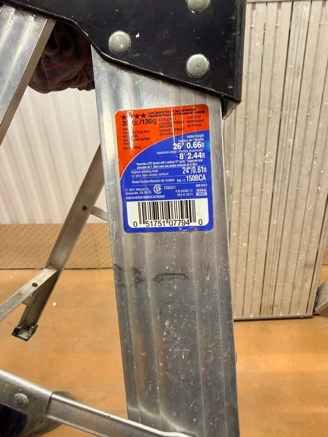 This is a Werner 3-step aluminum step stool. It has a maximum standing height of 24" (0.61m) and a maximum load capacity of 300 lbs (136kg). It's great for reaching items around the house or workshop!