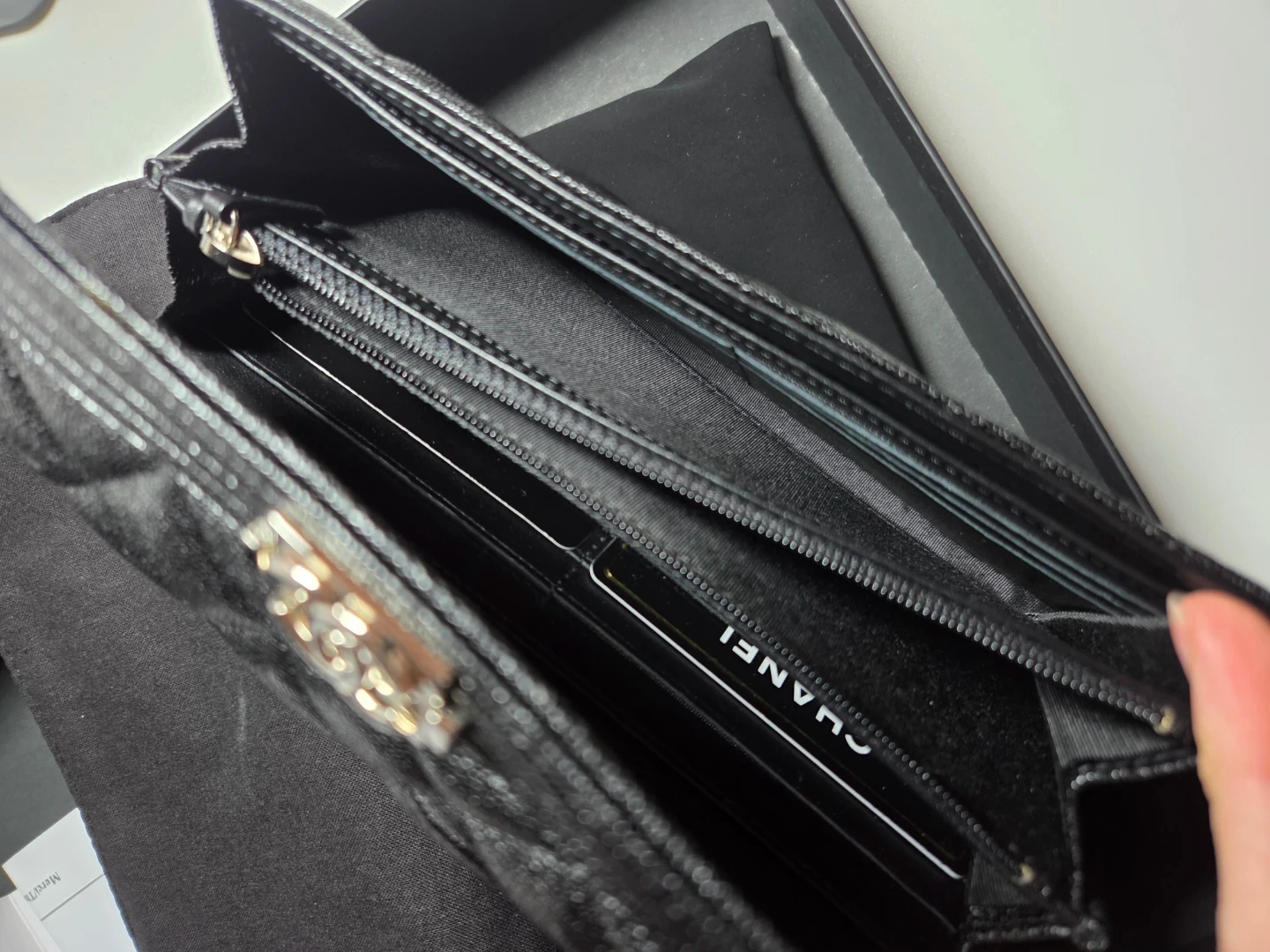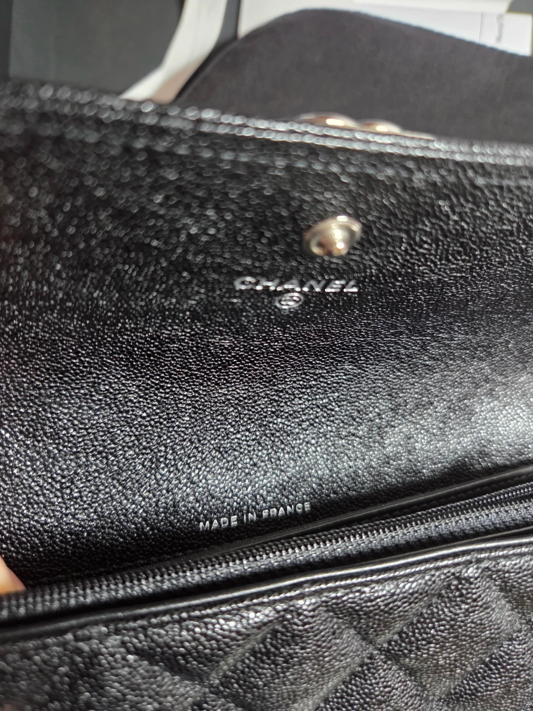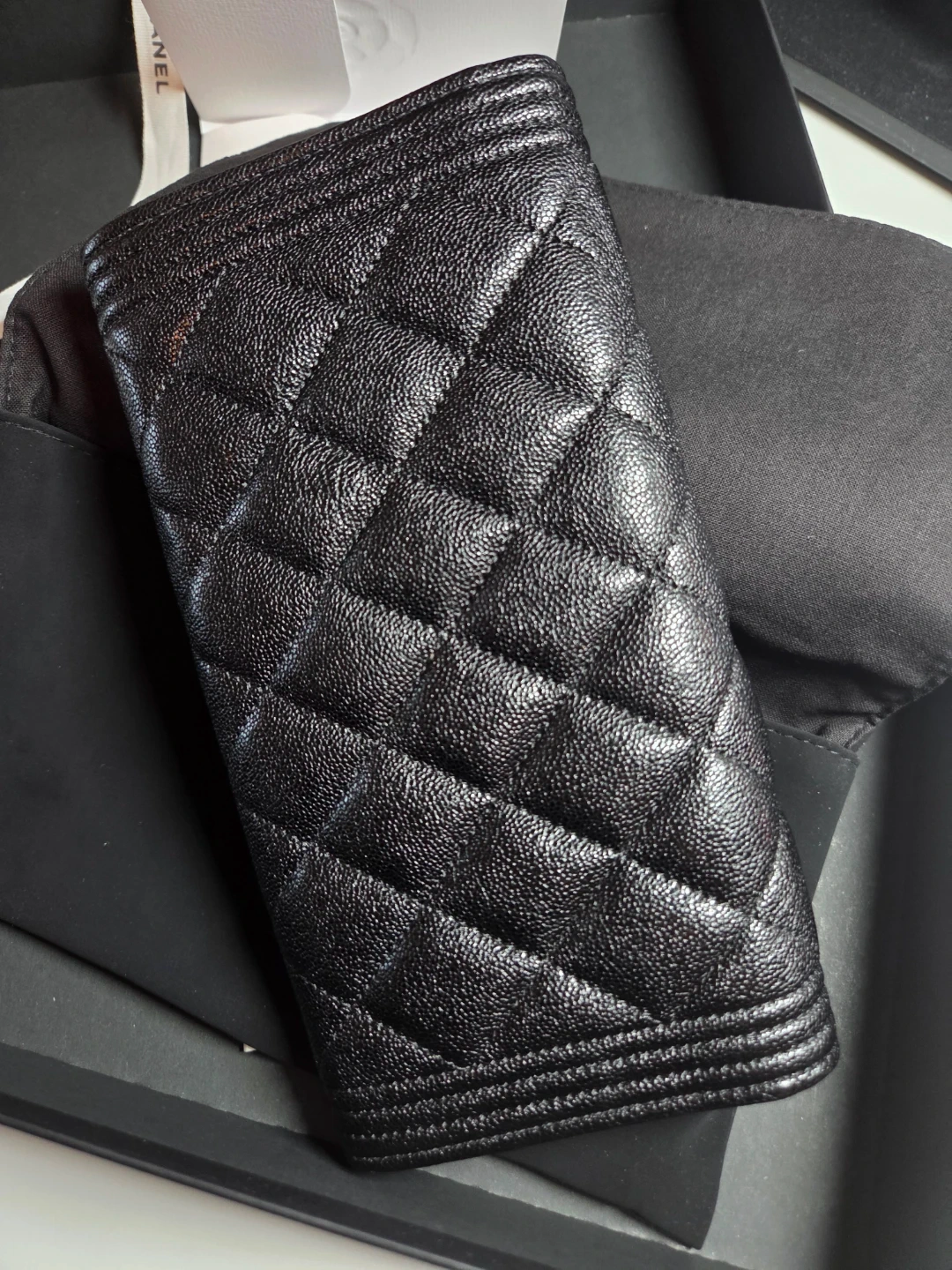 Authentic CHANEL wallet with classic quilted caviar black leather. Has multiple interior card slots and zippered closure inside. Made in France.
