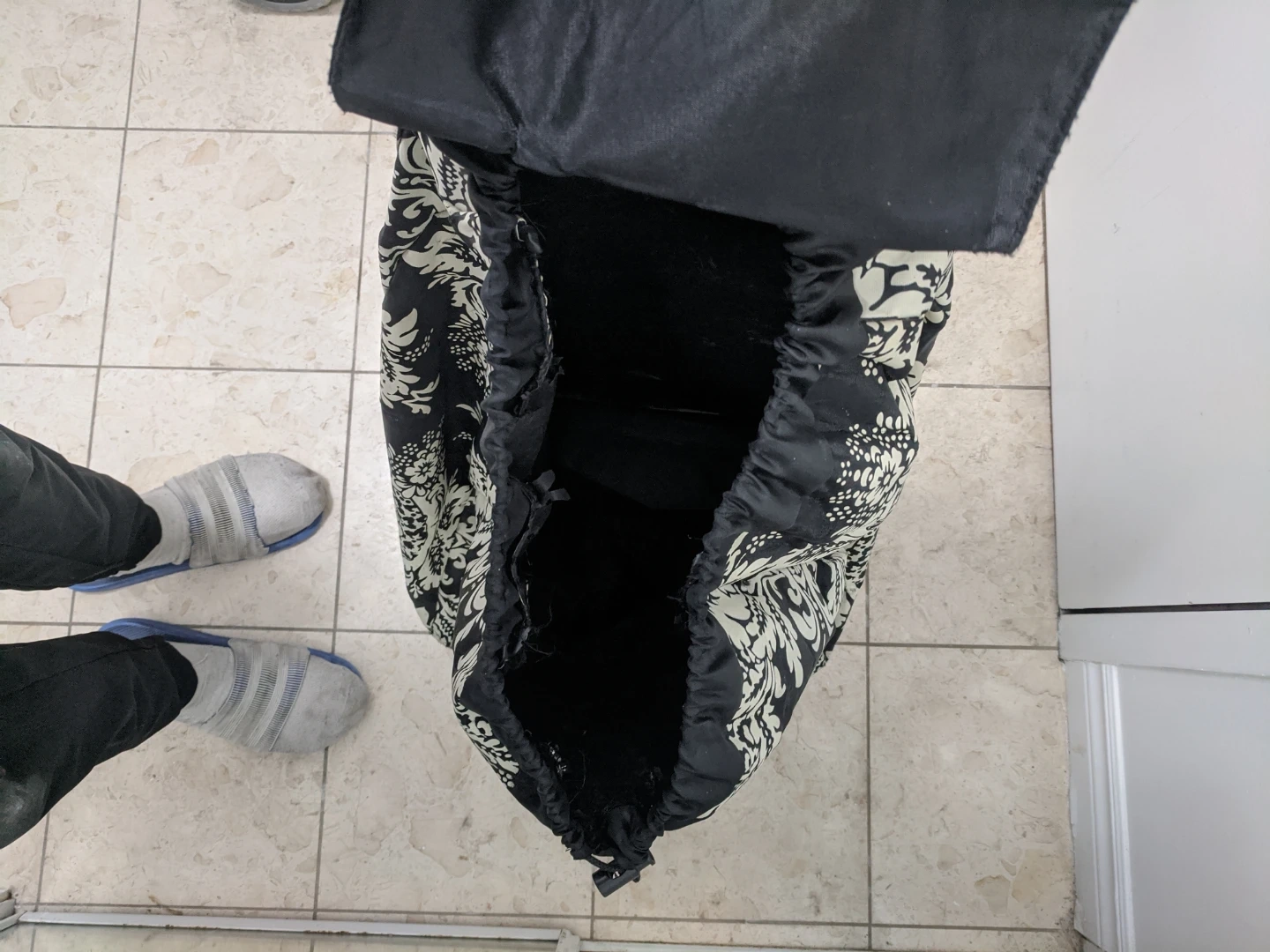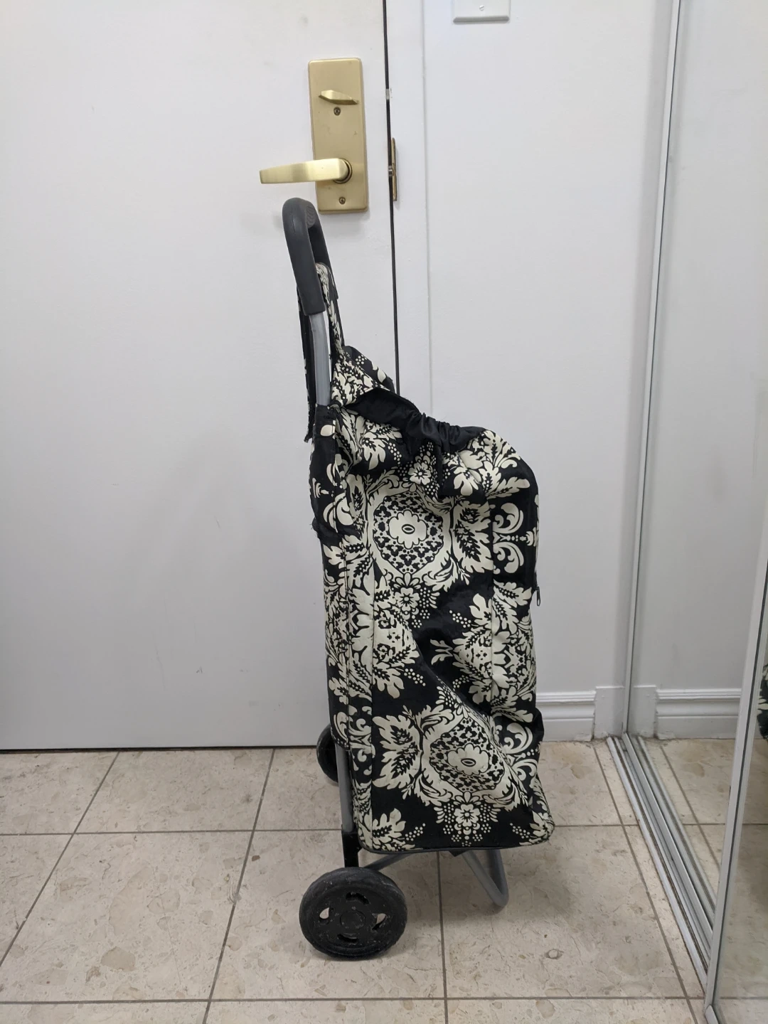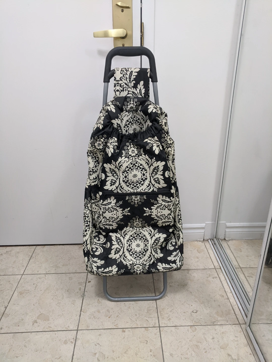 A black shopping trolley with a damask pattern. It has a large main compartment and a front zippered pocket. The trolley is lightweight and easy to manoeuvre. Used but Ok.