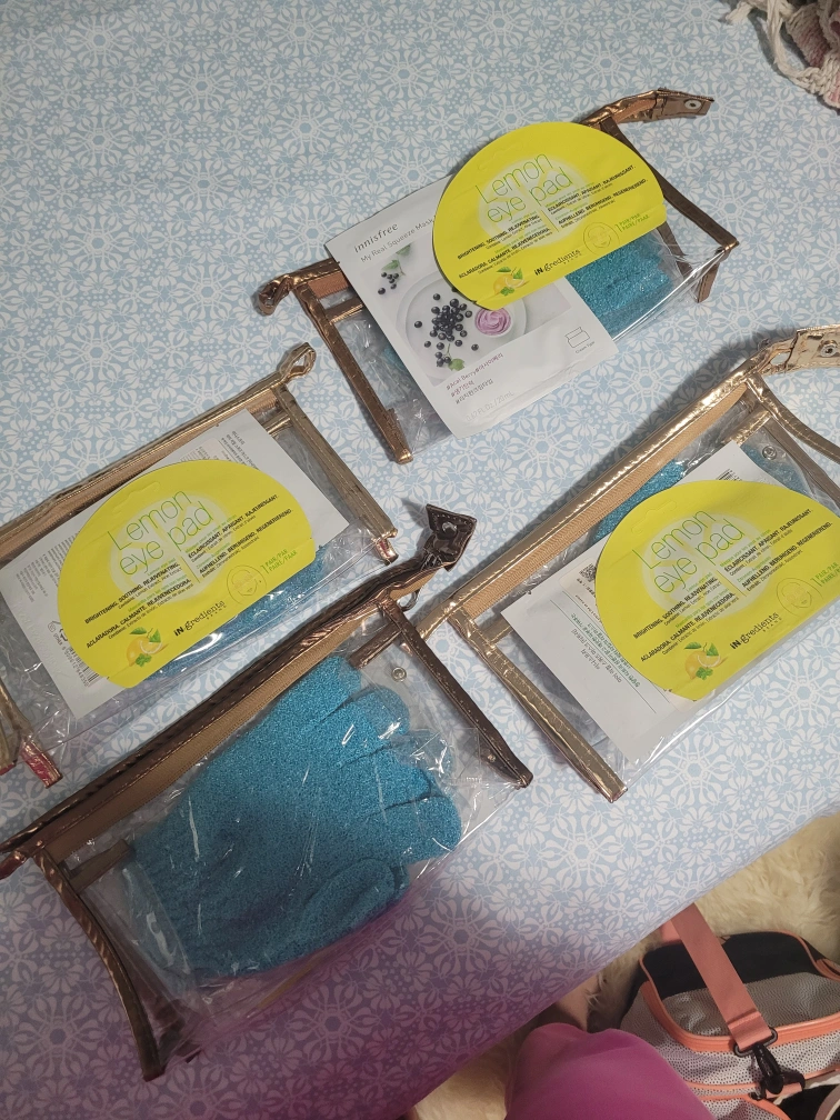 Selling a set that includes Innisfree My Real Squeeze Mask and Lemon Eye Pads! The eye pads are designed to be brightening, soothing, and rejuvenating. They're perfect for a little at-home spa day. The set also includes a small blue exfoliating glove! Get ready to pamper yourself