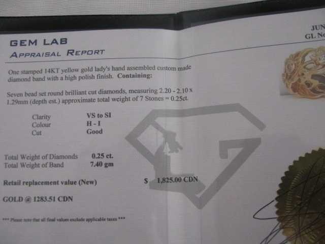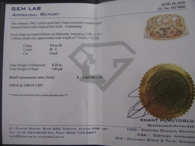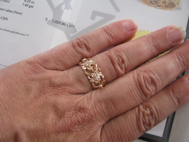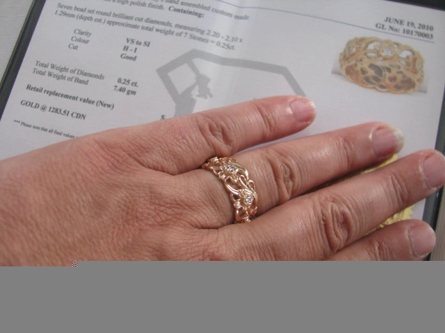 Ornate custom band, 14k yellow gold, size 8. Heirloom piece with an older appraisal from 2010 valuing it at $1815.00. Features Art Deco style with VS to SI, H-I, good cut diamonds totaling .25ct. Weighs 7.4 grams. Condition is used but like new. Cash accepted.