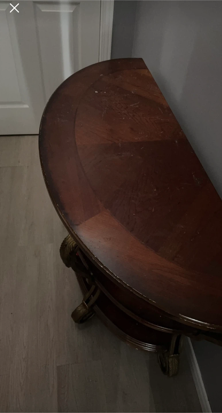 This is a dark wood console table with a curved front. It has ornate gold-toned legs and trim. It's a classic piece for an entryway or hallway.