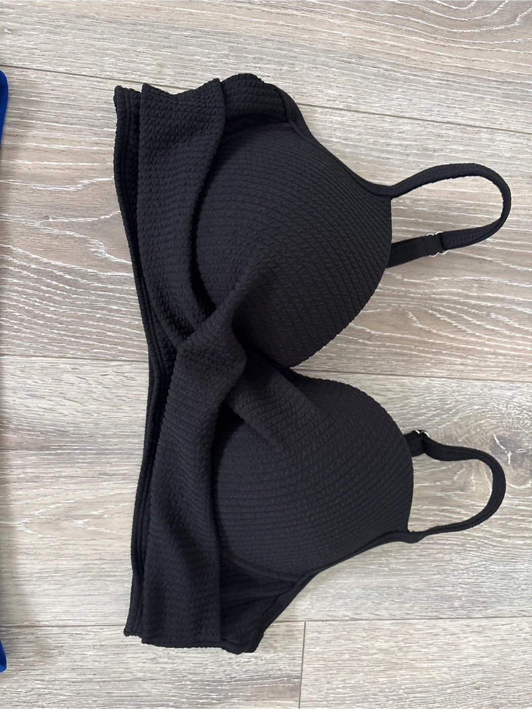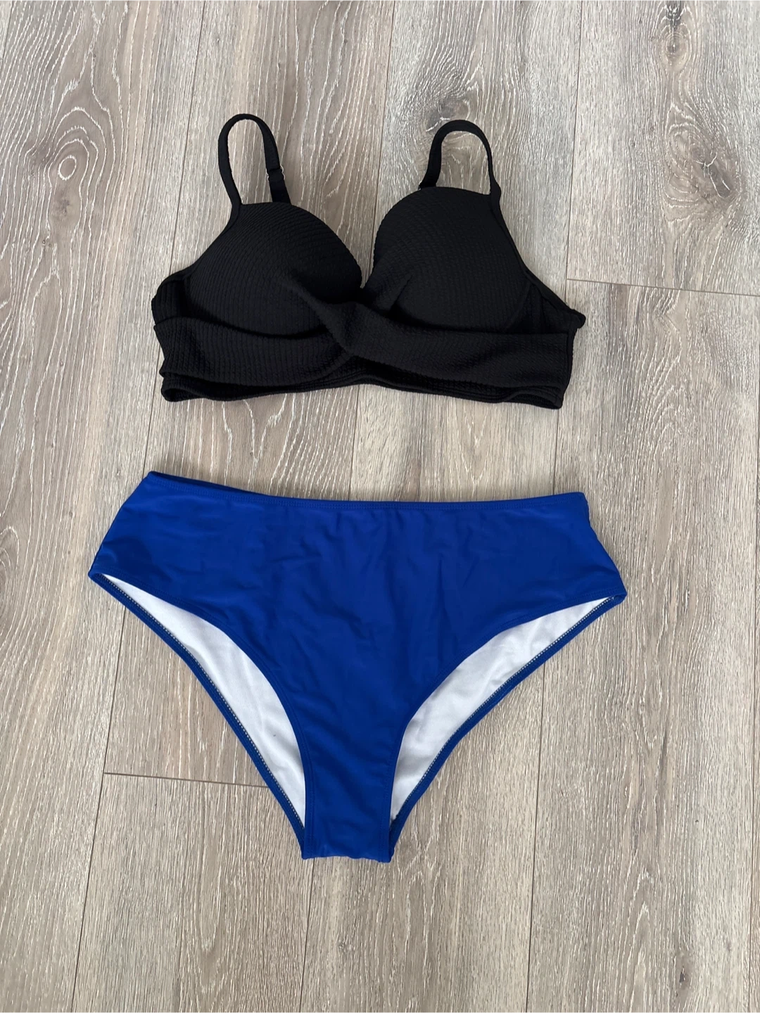 Brand New This is a two-piece swimsuit featuring a black textured bikini top and a vibrant blue high-waisted bottom. The top has adjustable straps and a twisted front detail. The bottoms offer full coverage. Nylon and spandex blend. Size 2 XL is like XL canadian size pick up walnut grove Langley