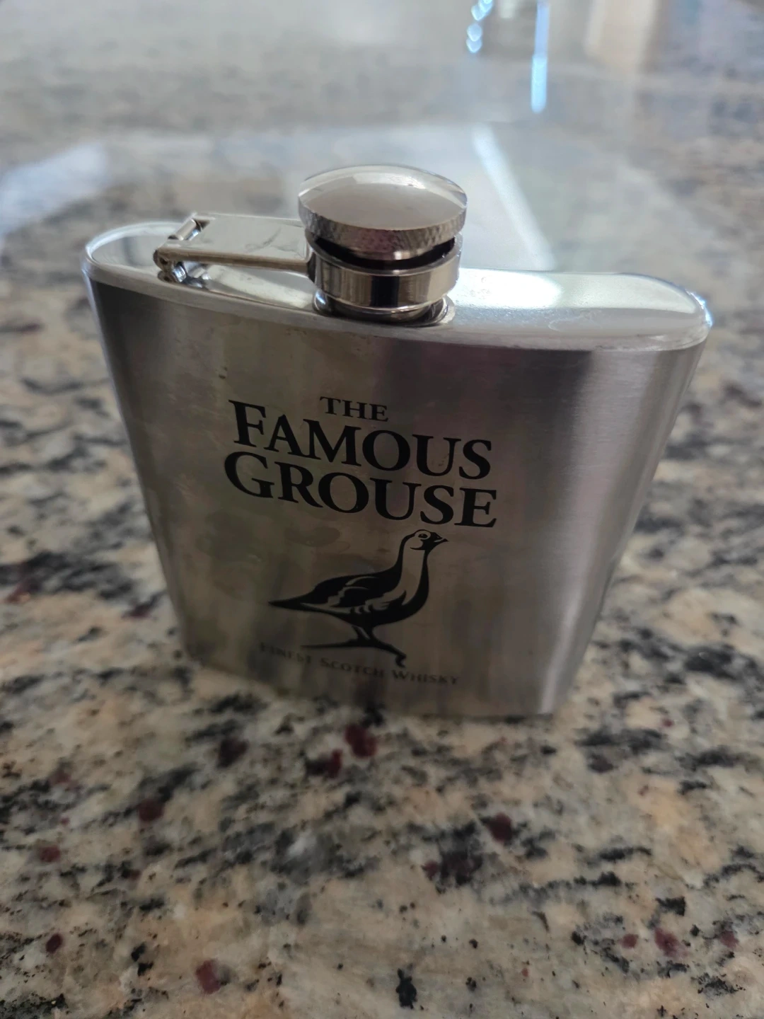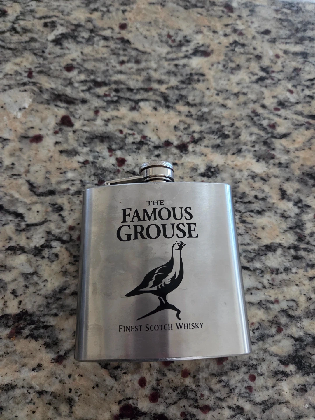 This is The Famous Grouse stainless steel hip flask. It's designed for carrying your favourite spirits. Perfect for taking on the go! Never Used