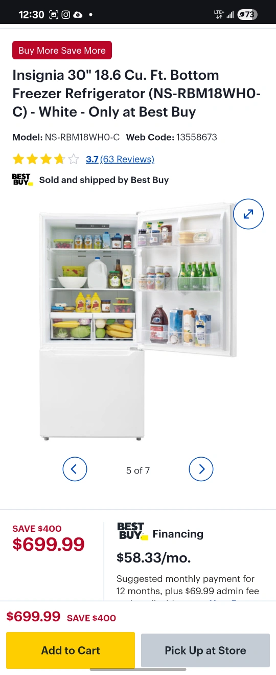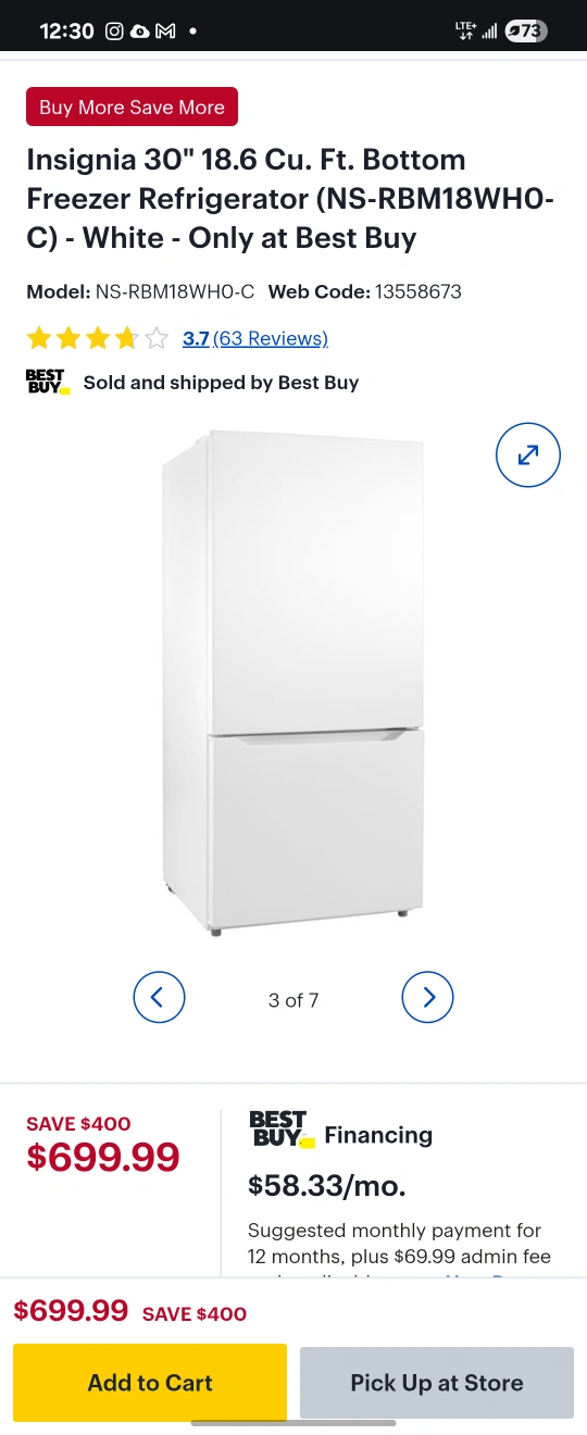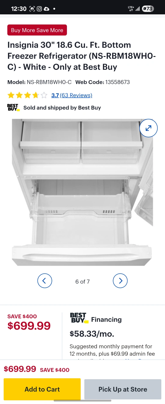 Selling an Insignia 30" 18.6 Cu. Ft. Bottom Freezer Refrigerator in white. It's in great condition and ready for a new home! Retails for $699.99 at Best Buy