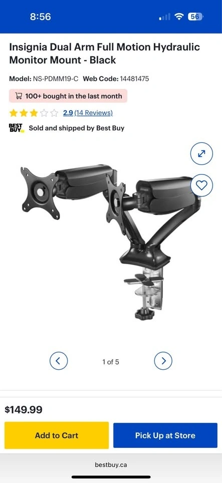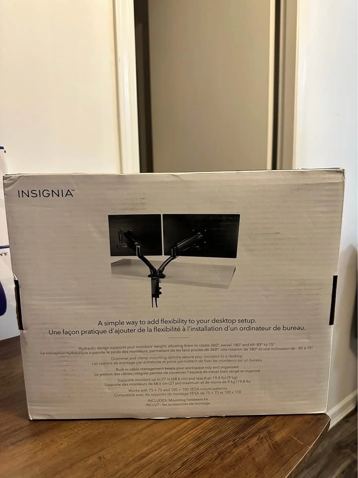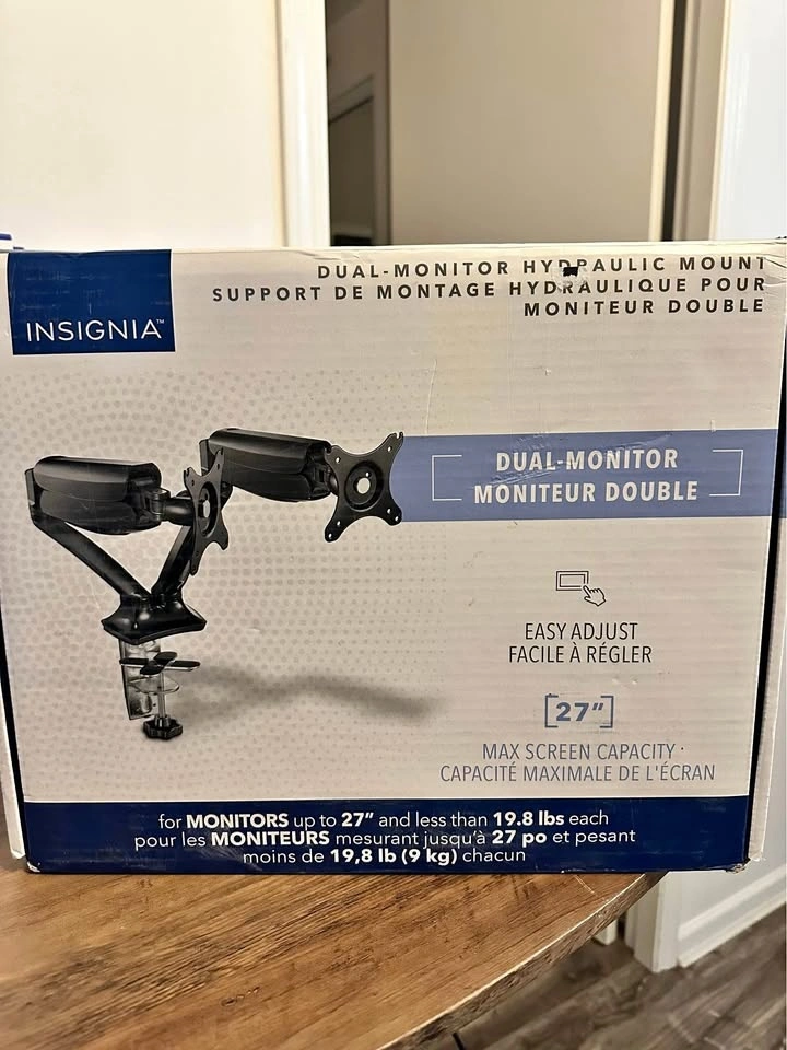 26Brand new Insignia Hydraulic Dual-arm mount holds 2 monitors with screen sizes from 17" to 27" and weighing up to 9kg (19.8 lb.) Supports 75mm x 75mm and 100mm x 100mm VESA-mount-compatible monitors Dimensions: Width: 80.2cm (31.57"); height: 41.5cm (16.34"); depth: 8.5cm (3.35") New one being sold for $149+taxes at best-buy. Pickup near edmonds skytrain station.