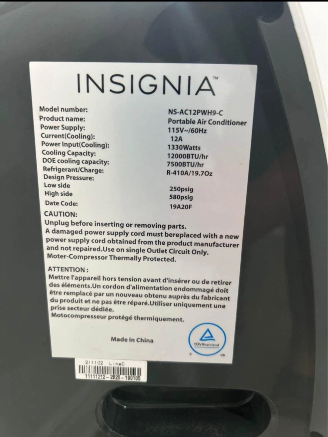 10Selling an Insignia portable air conditioner, model NS-AC12PWH9-C. It's in great shape and ready to keep you cool! It uses 115V~/60Hz power supply, with a cooling capacity of 12000BTU/hr. Perfect for small spaces!