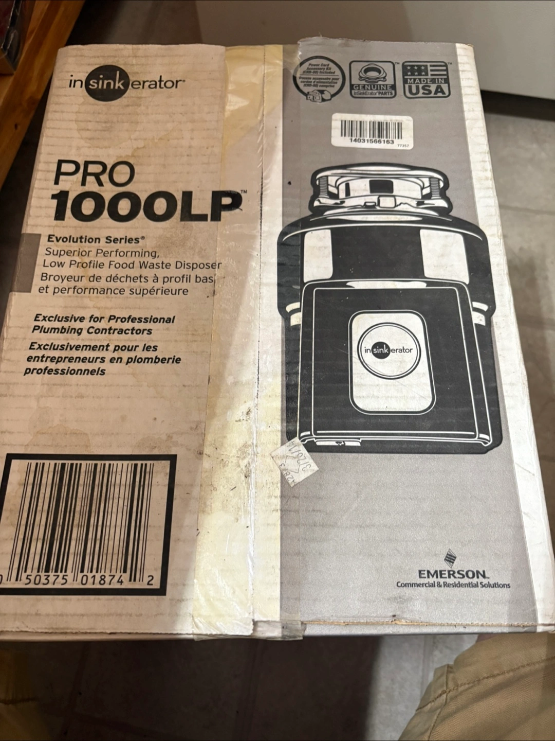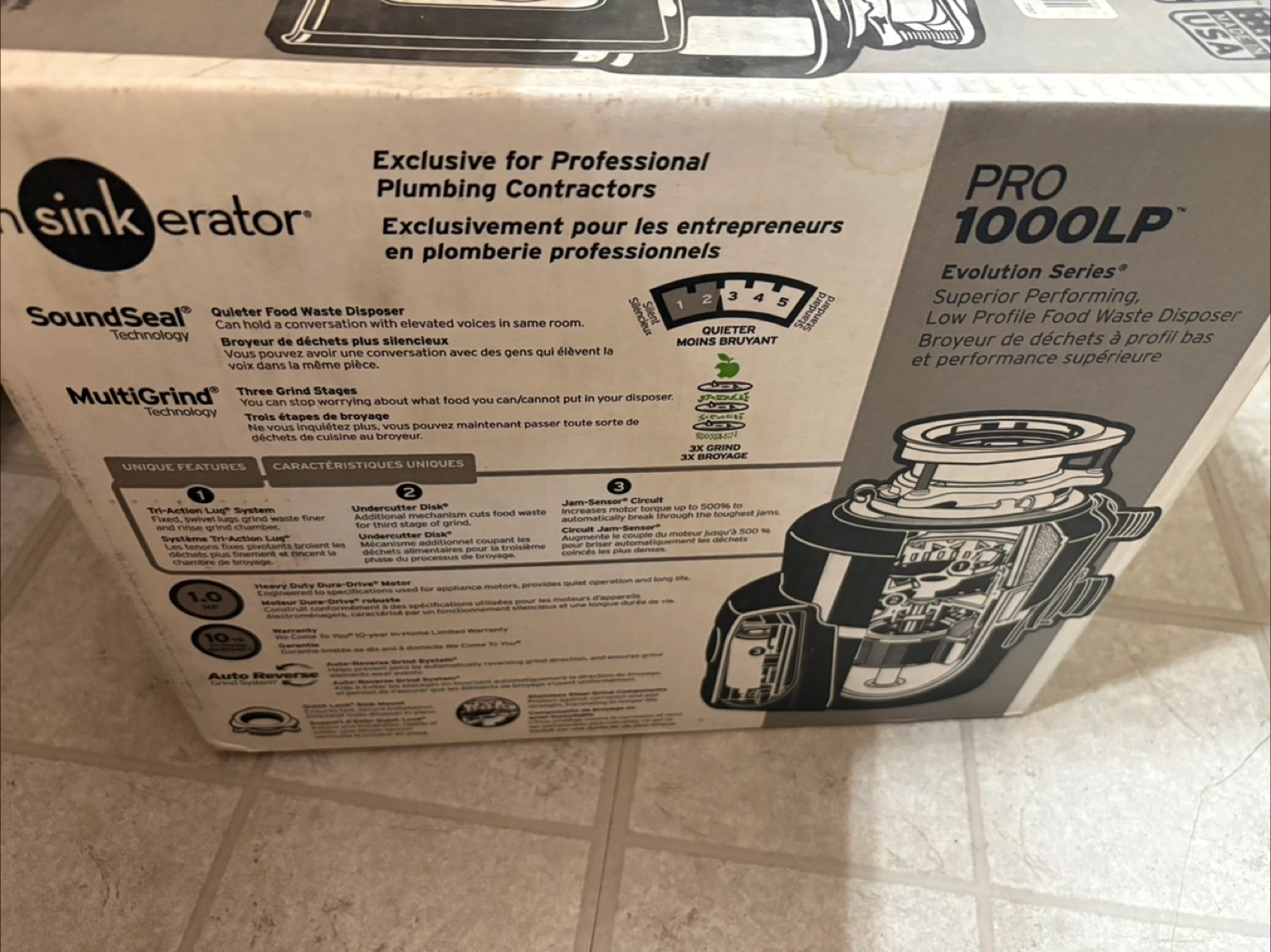 10Selling an InSinkErator PRO 1000LP Evolution Series food waste disposer. It's a low profile model with superior performance. The box highlights features like SoundSeal technology for quieter operation and MultiGrind technology for handling various types of food waste. It's designed for professional plumbing contractors and residential solutions Also have 120v outlet conversion kit.