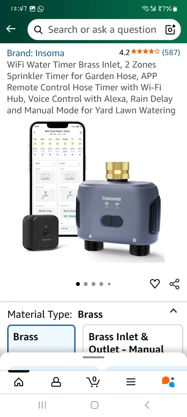 85Selling an Insoma WiFi water timer with a brass inlet. It's a 2-zone sprinkler timer for your garden hose. It has app remote control with Wi-Fi hub, voice control with Alexa, rain delay, and manual mode for yard lawn watering.