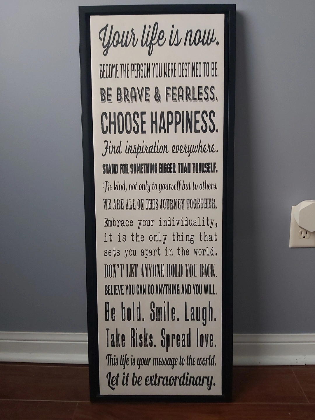 Framed canvas print featuring an inspirational message. Black text on off-white background. Motivational quotes for home decor. Cash only.