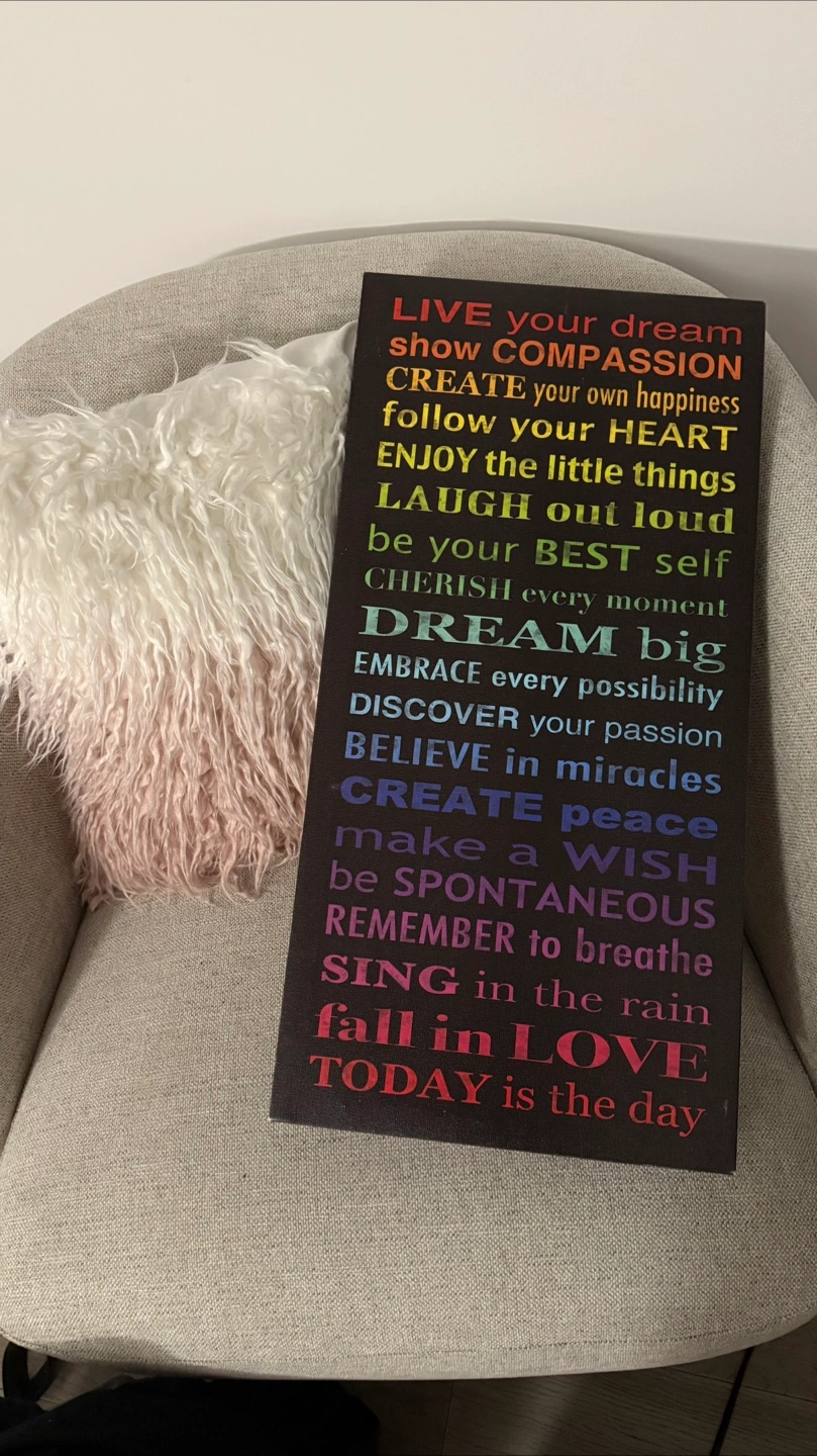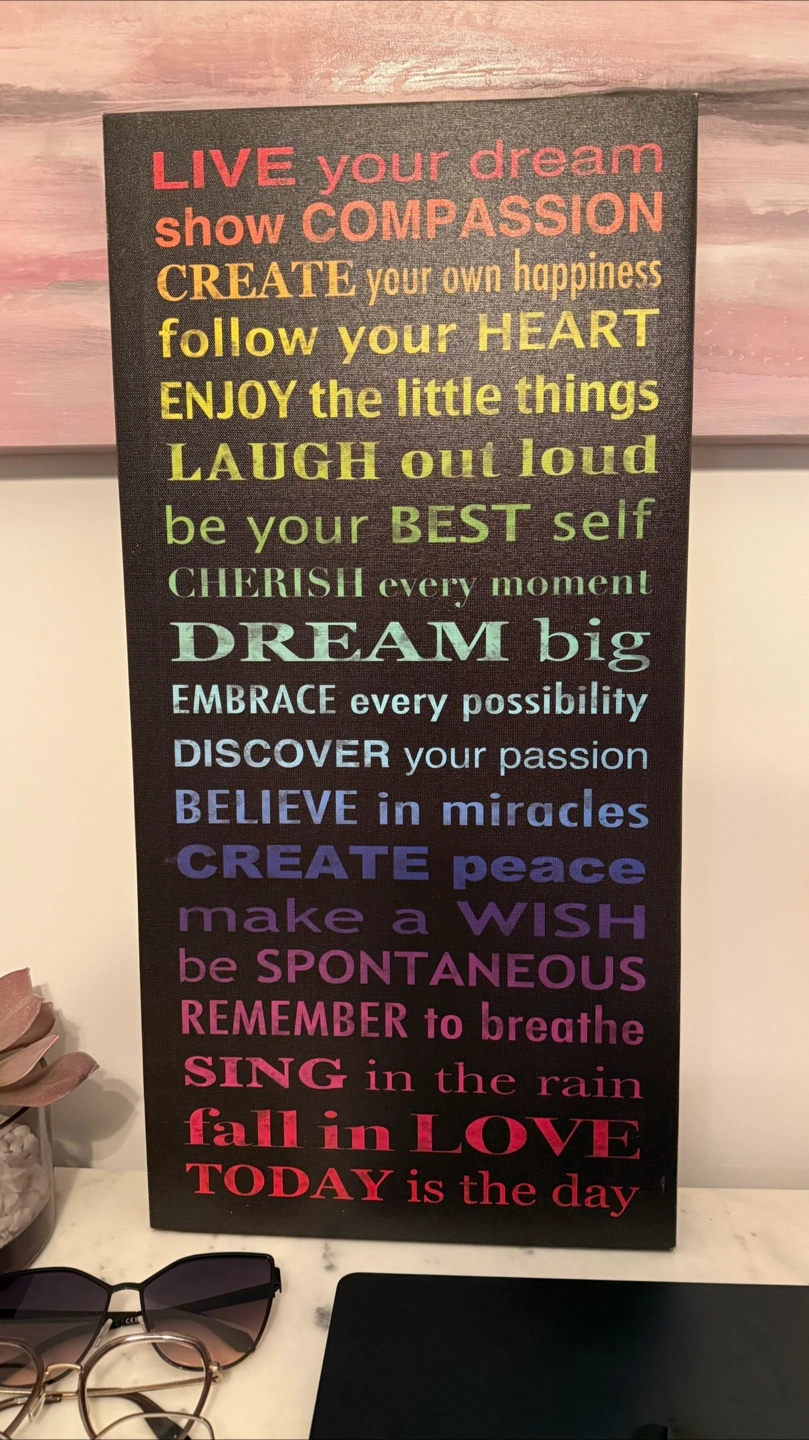 36Brighten your space with this colourful, uplifting hanging wall art canvas. Featuring positive and motivational phrases in a rainbow gradient, it’s perfect for a home office, bedroom, living room, or entryway. 🖼 Details: •Size: approx. 11.5”x23.5” canvas •Lightweight and easy to hang •Great condition – no damage This piece is full of daily reminders like “show COMPASSION”, “DREAM big” and “DISCOVER your passion” – a perfect gift or personal pick-me-up. 📍 Pickup only in Liberty Village
