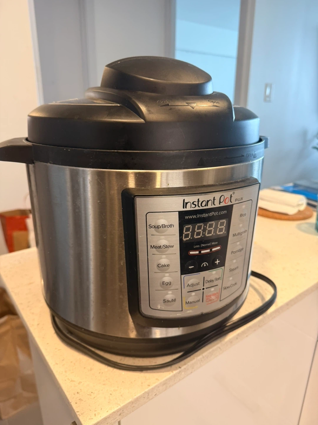 Selling an Instant Pot 8 Quart 6-in-1 Multi-Use Electric Pressure Cooker. It has settings for soup/broth, meat/stew, cake, egg, sauté, manual, rice, multigrain, porridge, steam, and slow cook. It's in great shape.
