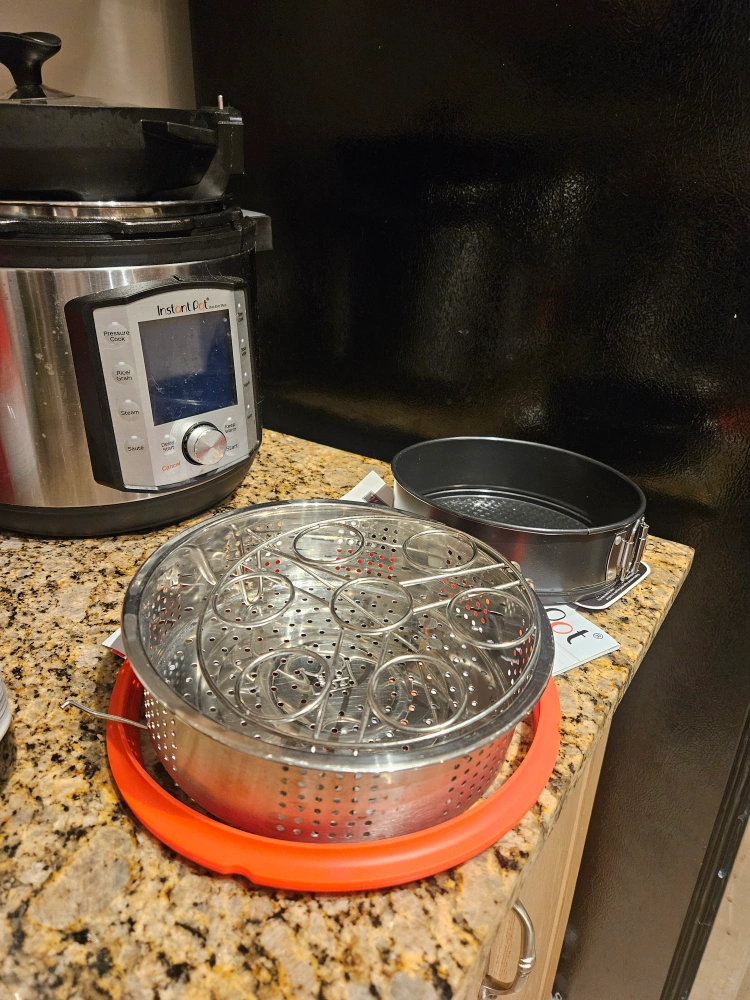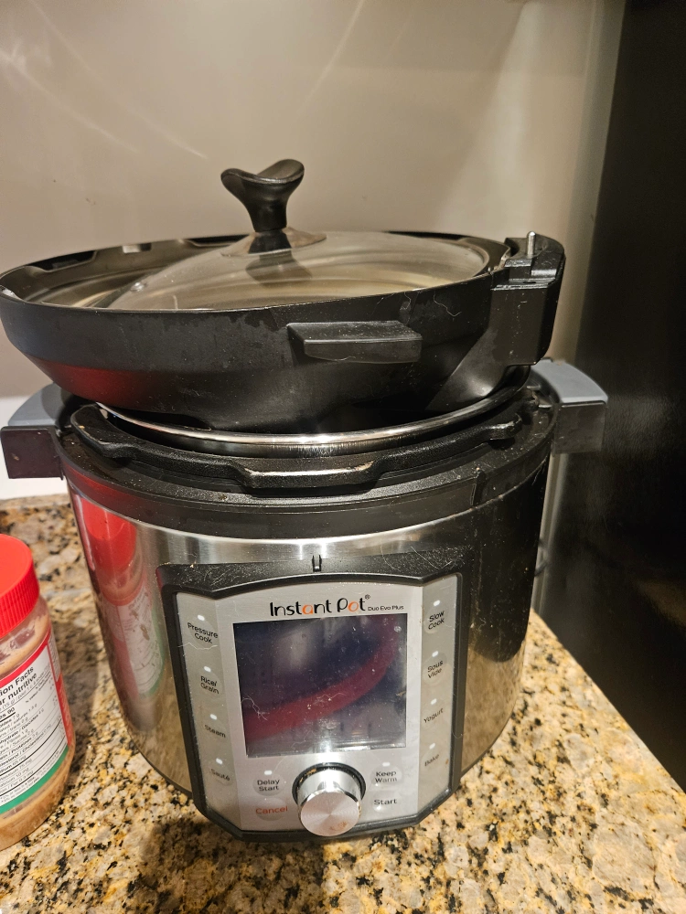 Selling an Instant Pot Duo Evo Plus! It comes with the lid, a steamer basket, and a cake pan. It's in good condition and ready for a new home. Perfect for quick and easy meals!
