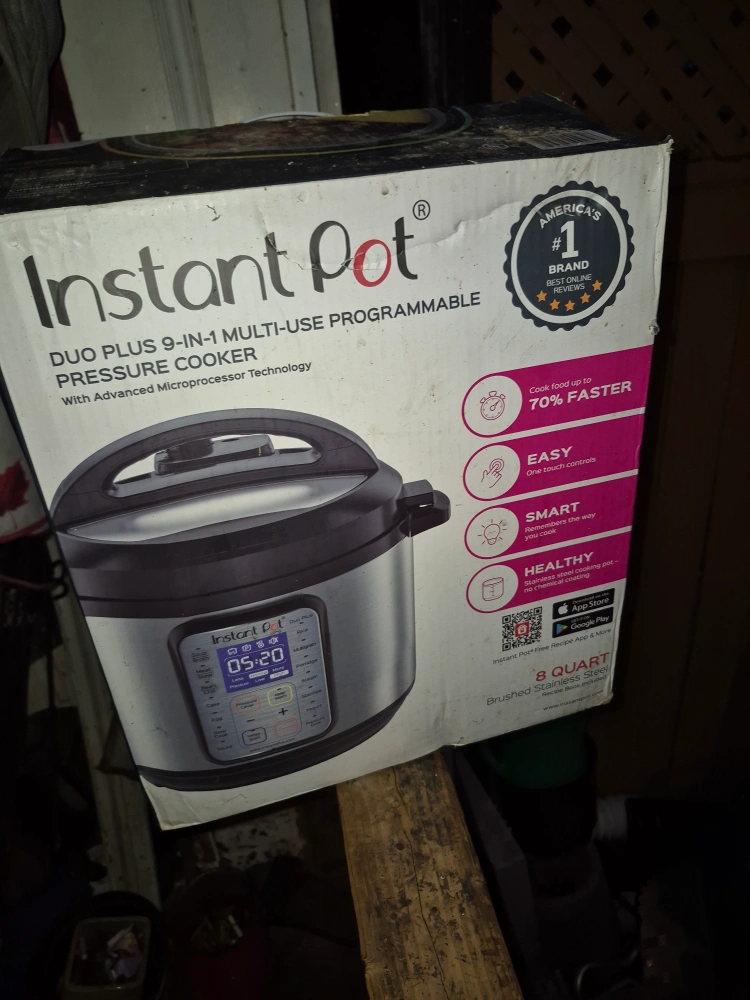 Selling an Instant Pot Duo Plus 9-in-1 multi-use programmable pressure cooker. It has advanced microprocessor technology and can cook food up to 70% faster! It features easy one-touch controls and smart programming. It's an 8 quart model made of brushed stainless steel. Comes with the original box