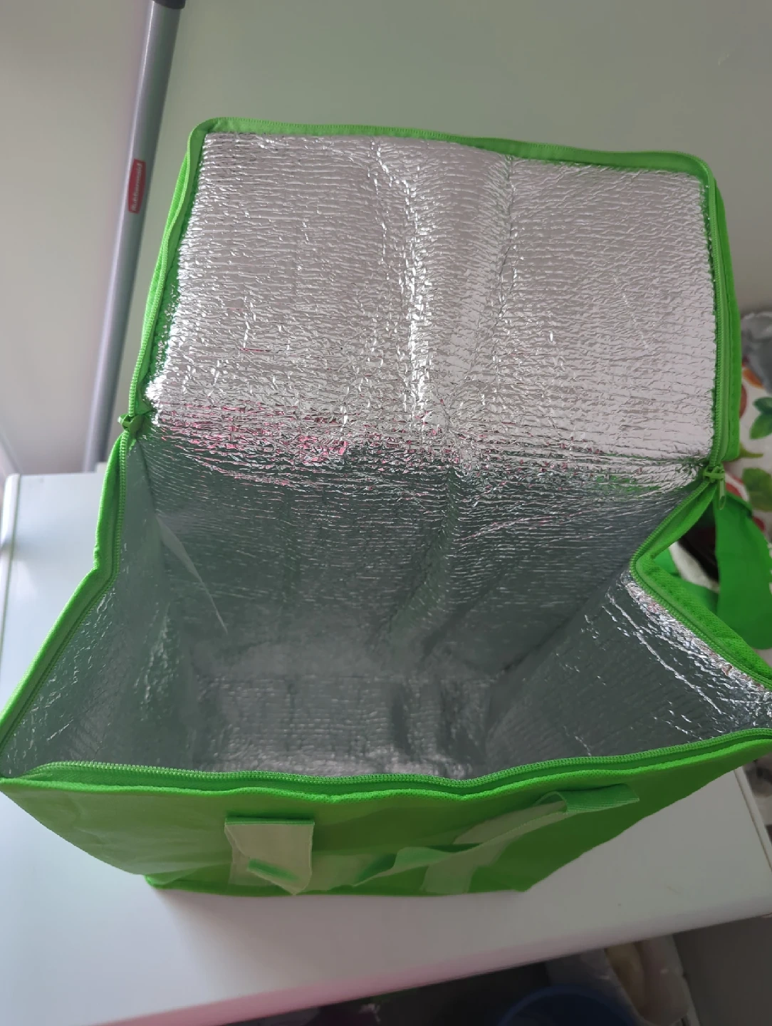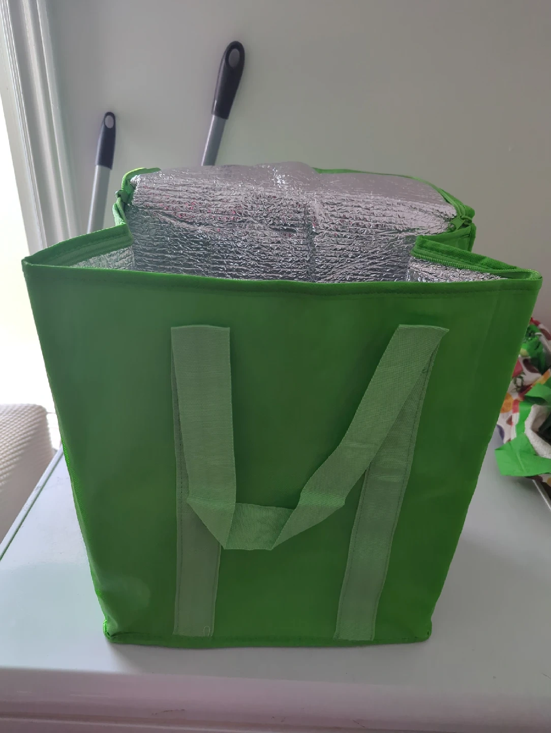 60Keep your deliveries or groceries cool or warm with this handy insulated reusable grocery bag! It's a vibrant green colour and in great condition. Perfect for food deliveries, shopping trips or picnics