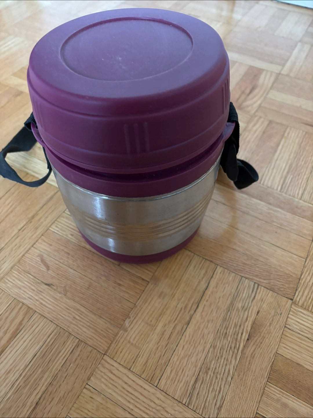 Selling an insulated food container with a purple lid! It has a stainless steel body and a convenient carrying strap. Great for keeping your lunch warm or cold on the go
