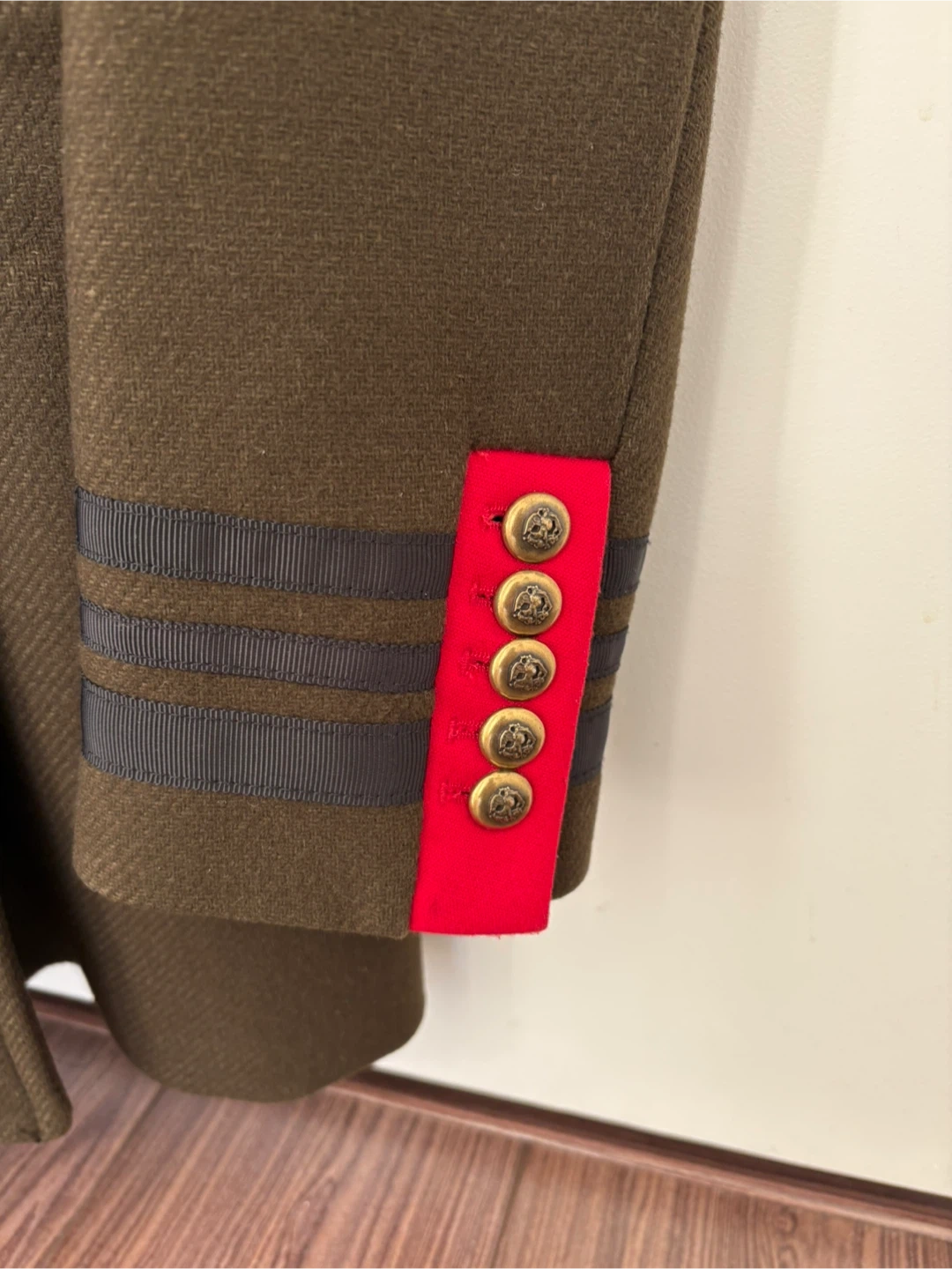 This ZARA WOMAN jacket features a stylish military-inspired design with gold-tone buttons and decorative ribbon detailing on the cuffs. It's a double-breasted style in a dark olive green colour. Made from a wool blend.