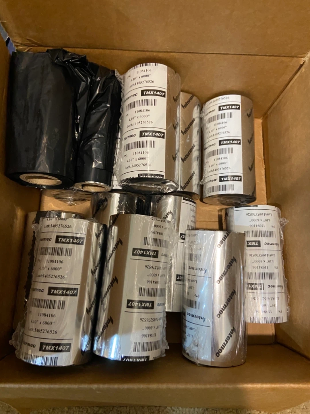 12Selling a collection of Intermec TMX1407 ribbons. Each ribbon measures 4.10" x 6000". They are in excellent condition and ready for use! 12 rolls new & 1.2 roll open
