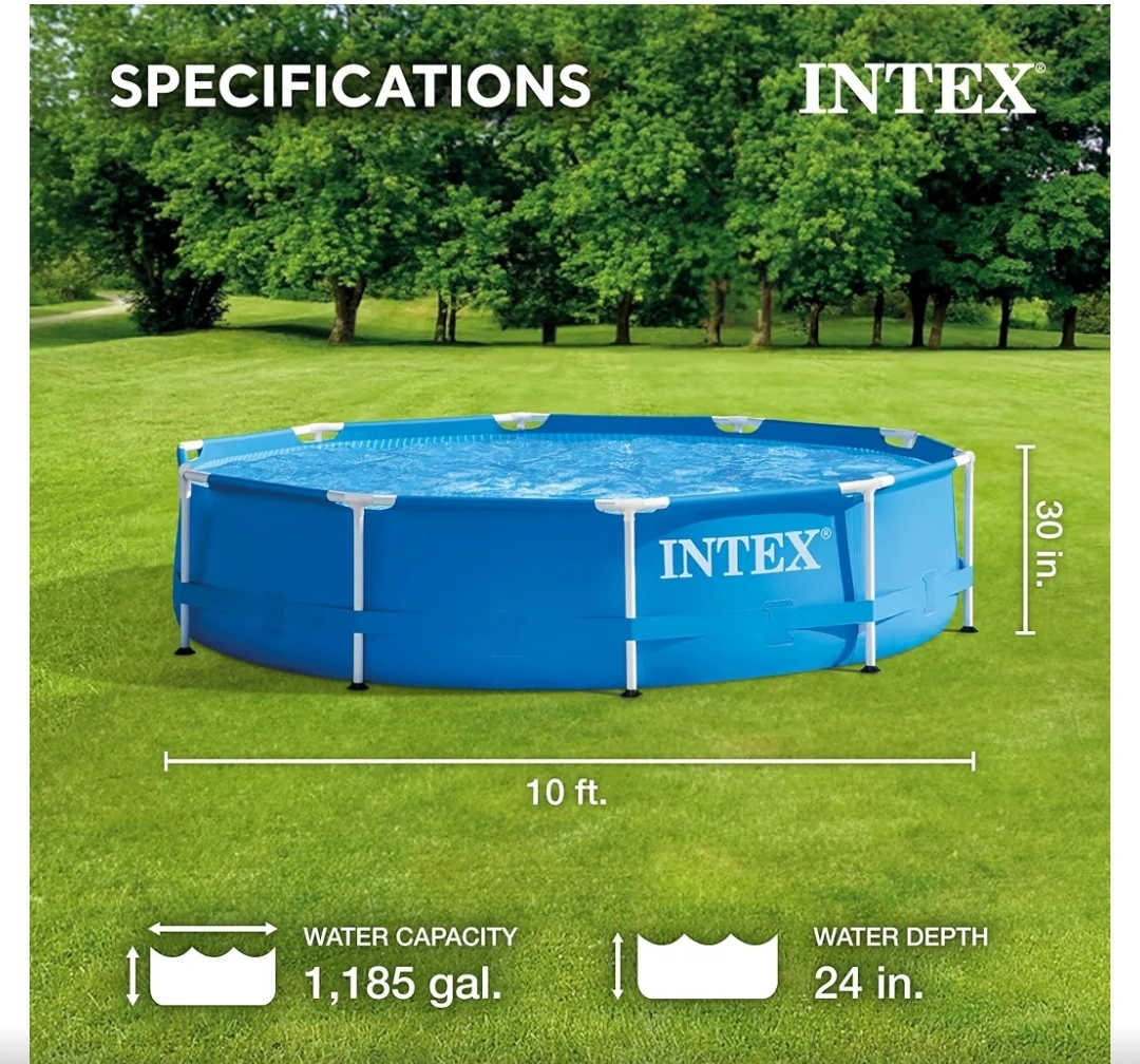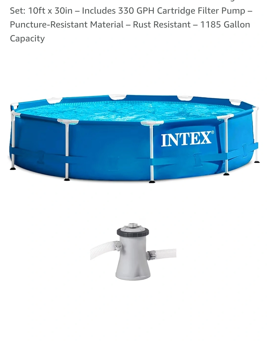 Get ready for summer with this Intex above-ground swimming pool! It's 10 feet in diameter and 30 inches tall. The set includes a 330 GPH cartridge filter pump to keep the water clean. It's made with puncture-resistant material and is rust-resistant, so it's built to last. It holds 1185 gallons of water, perfect for cooling off on hot days. I have a water pump