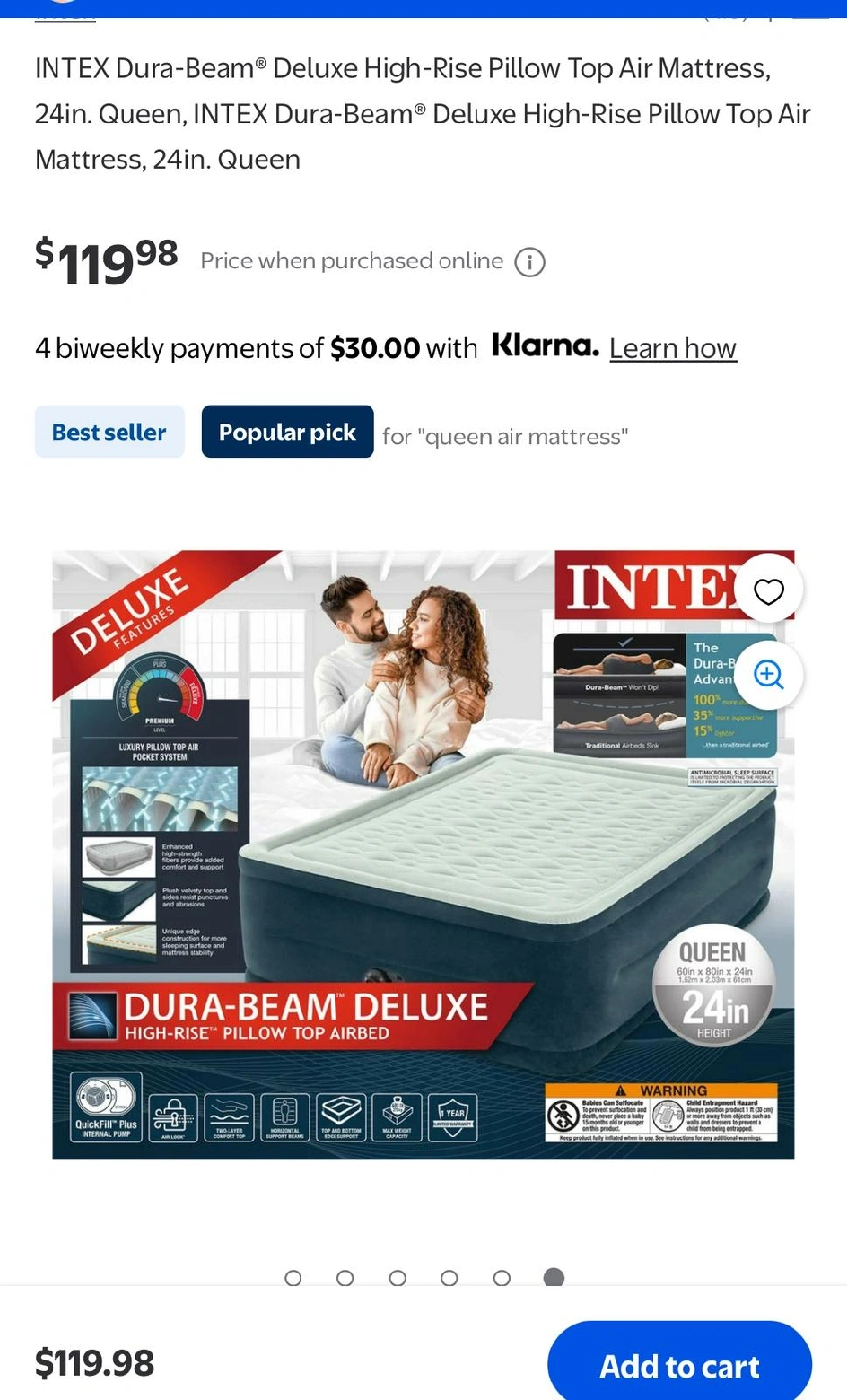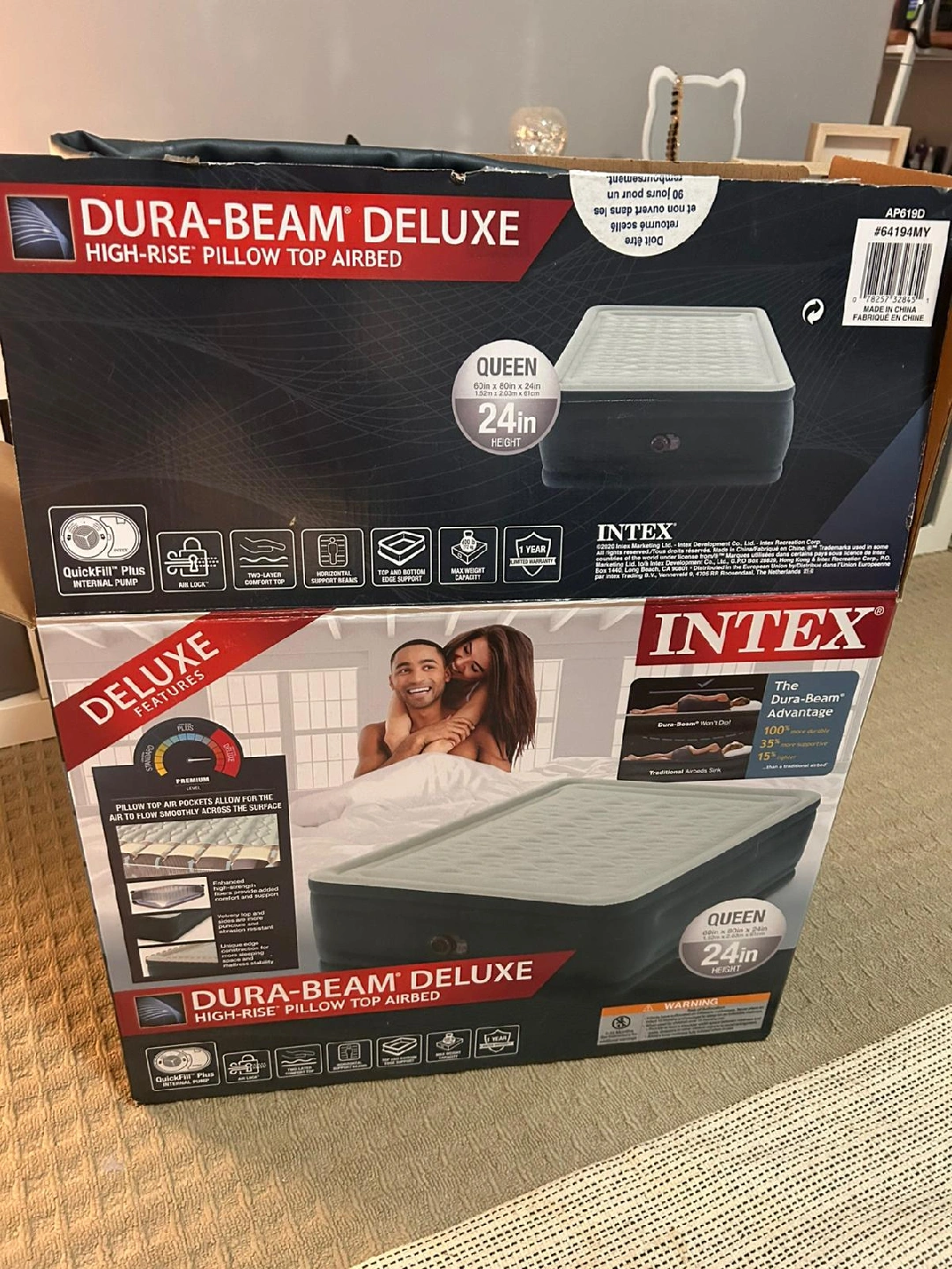 65Selling a brand new INTEX Dura-Beam Deluxe High-Rise Pillow Top Airbed. This is a queen-sized air mattress with a 24-inch height. It includes a QuickFill Plus internal pump. It was originally bought for $119.98