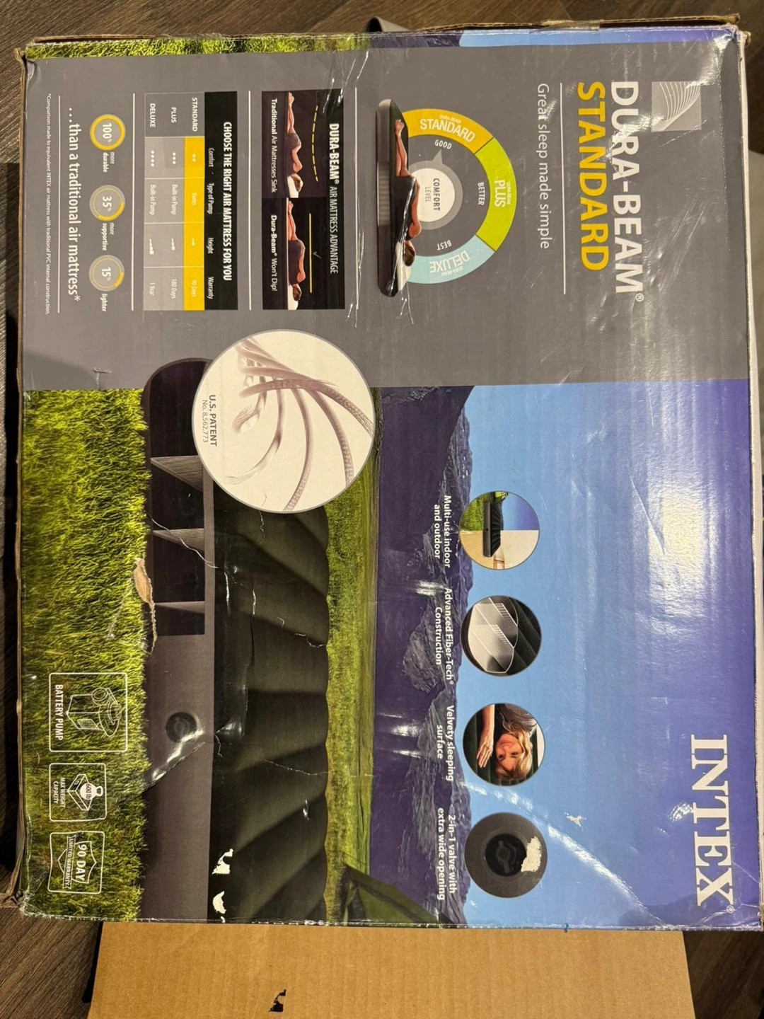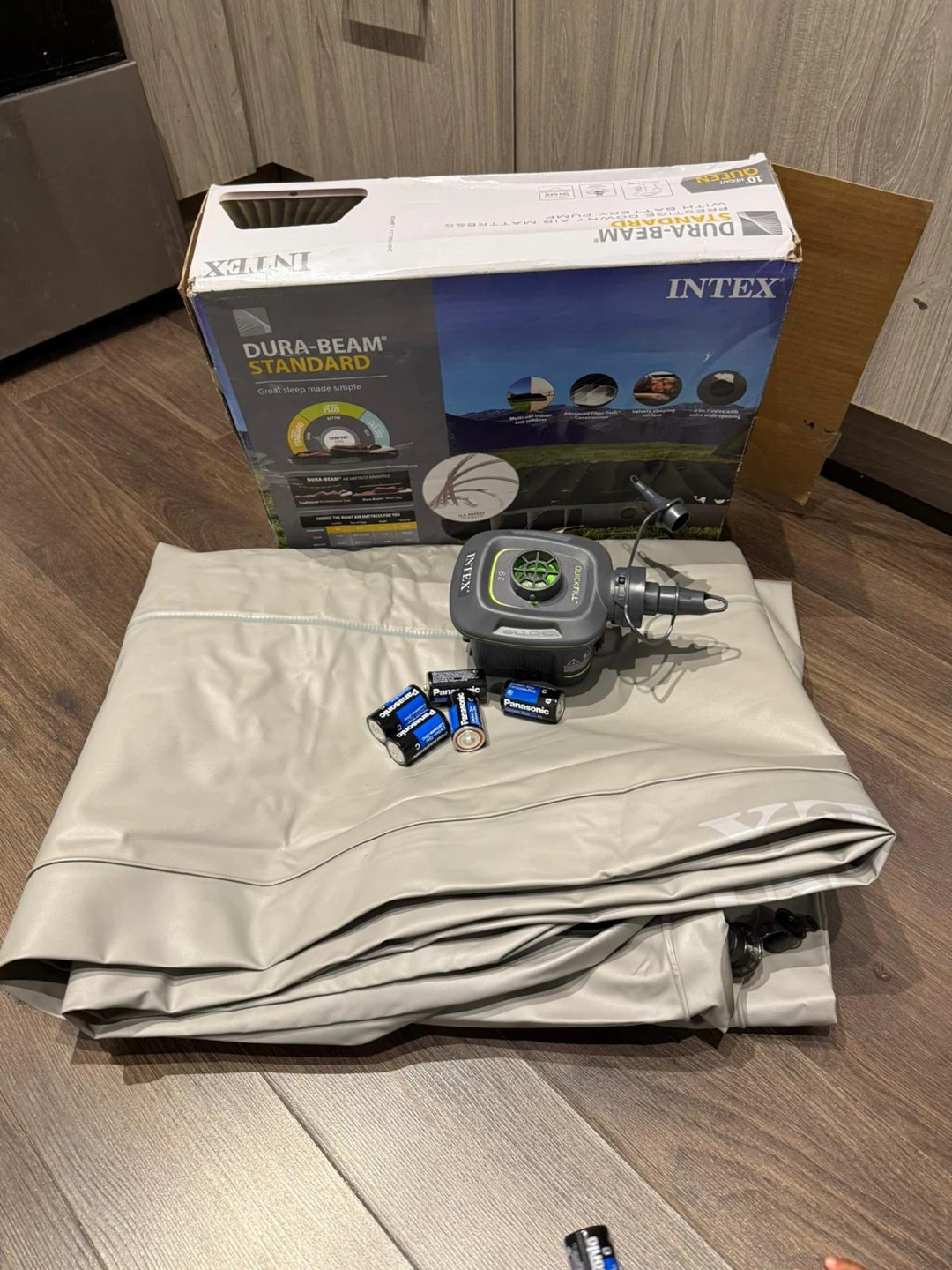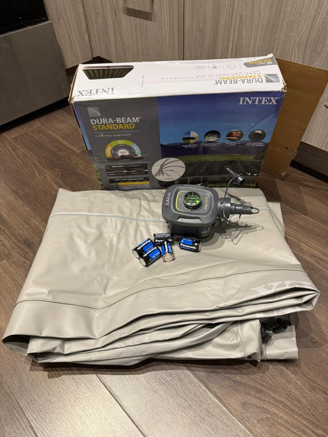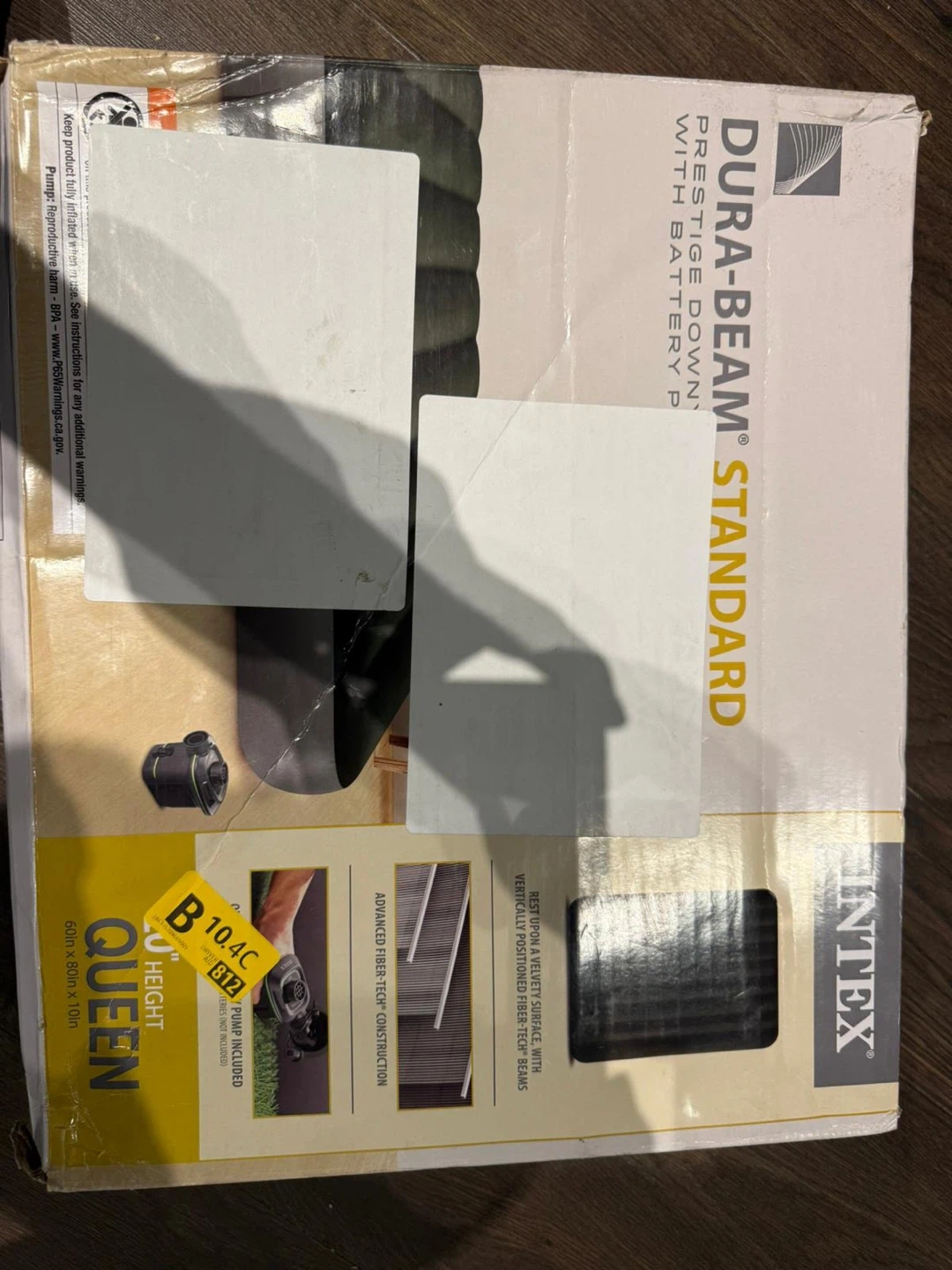 Selling an Intex Dura-Beam Standard queen-sized air mattress. It comes with a battery-powered pump for easy inflation. The box is included!
