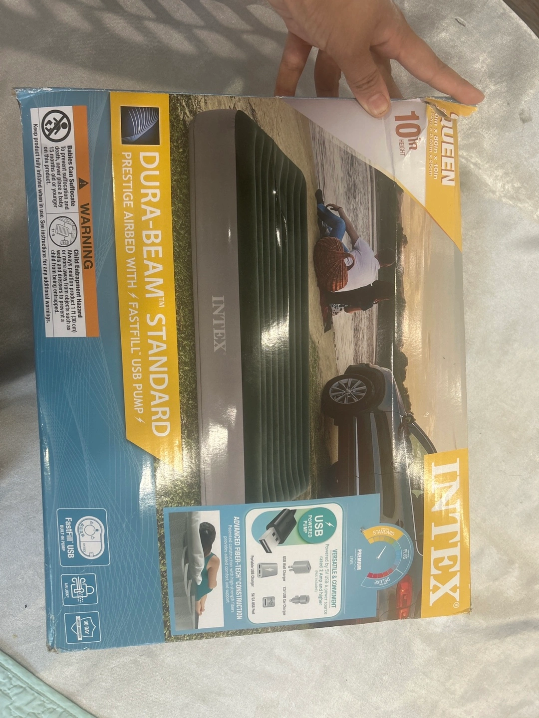 Selling a brand new Intex Dura-Beam Standard queen-sized airbed! It comes with a built-in USB powered pump for versatile and convenient inflation. The airbed features advanced Fiber-Tech construction with high-strength fibers for added comfort and support. It also includes a USB wall charger and a 12V USB car charger, so you can inflate it anywhere!