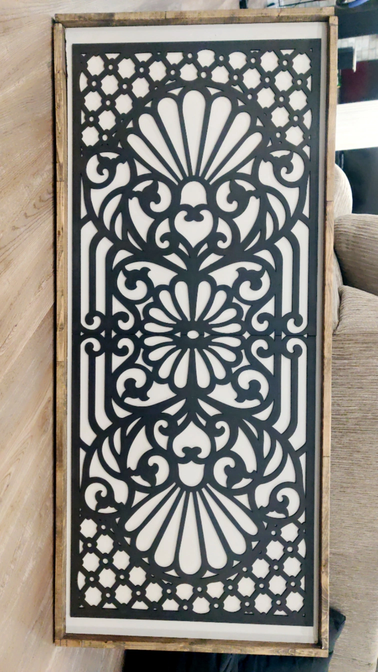 15Beautiful decorative wall panel. Features an ornate, laser-cut design. Wooden frame. Adds a touch of elegance to any room.