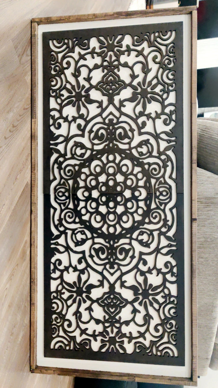 15Beautiful laser-cut wall art. Features a detailed floral design. Dark brown accents on a light background. Wooden frame.