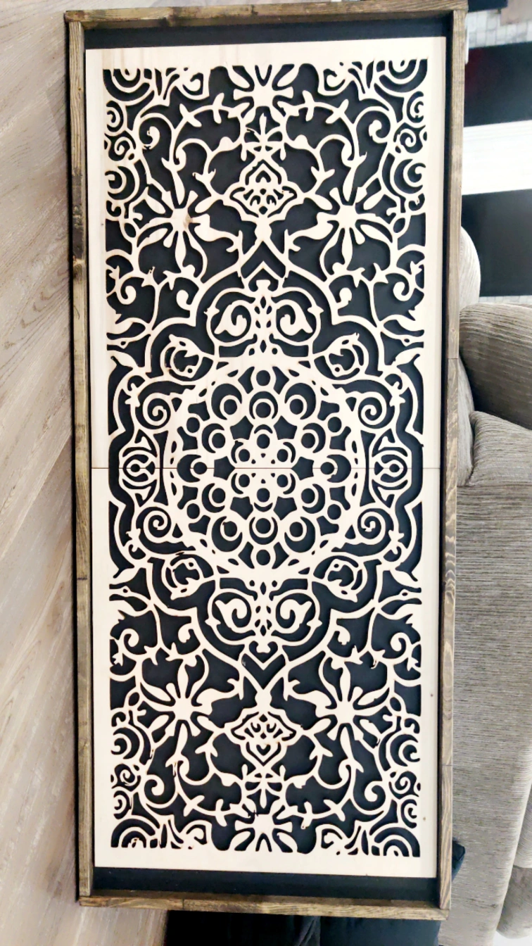 15Beautiful laser-cut wall art. Features a detailed mandala-like design. Dark background with light wood cutouts. Wooden frame. Unique home decor piece.
