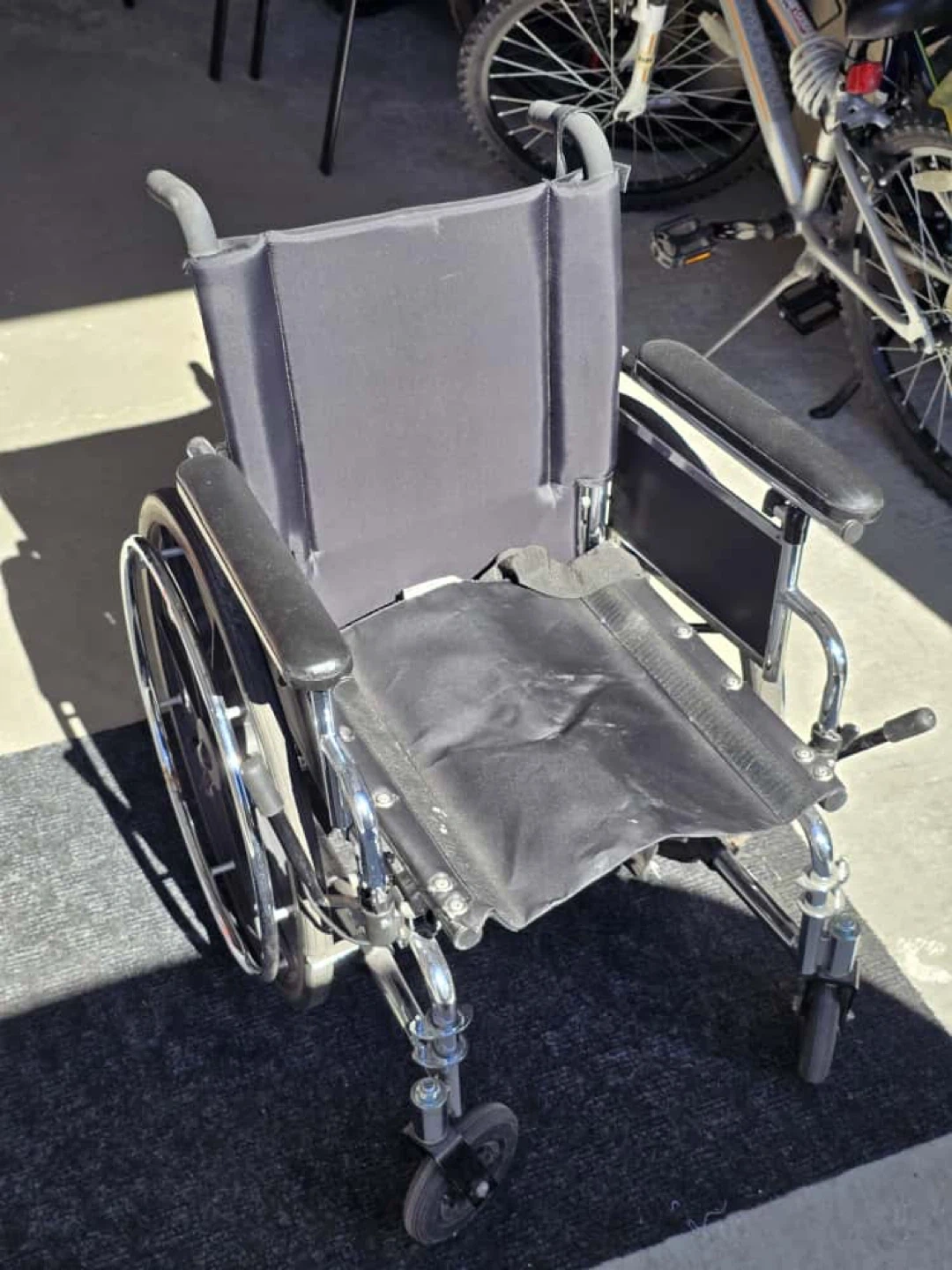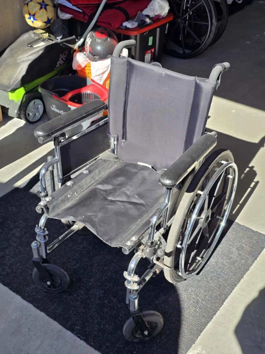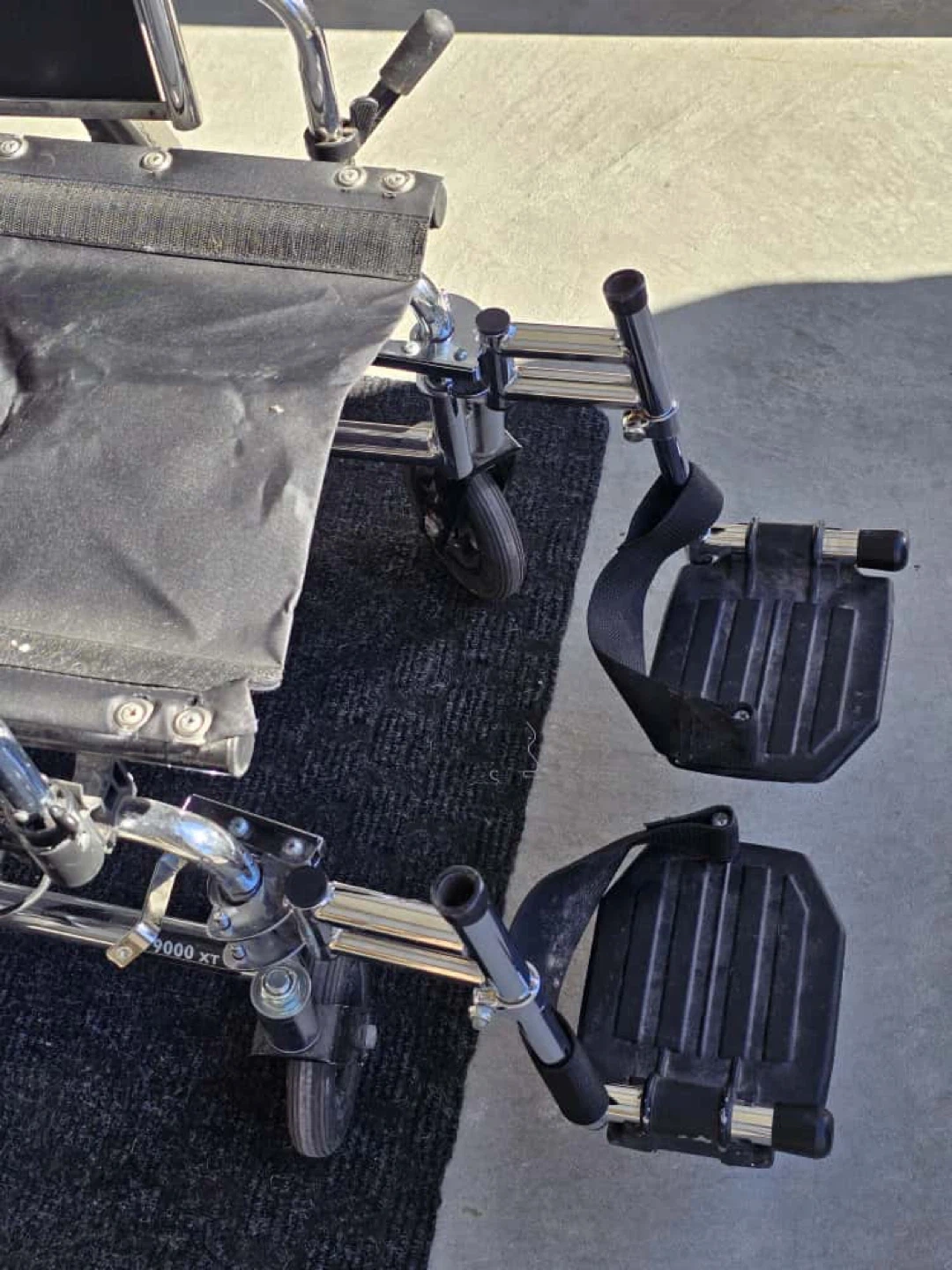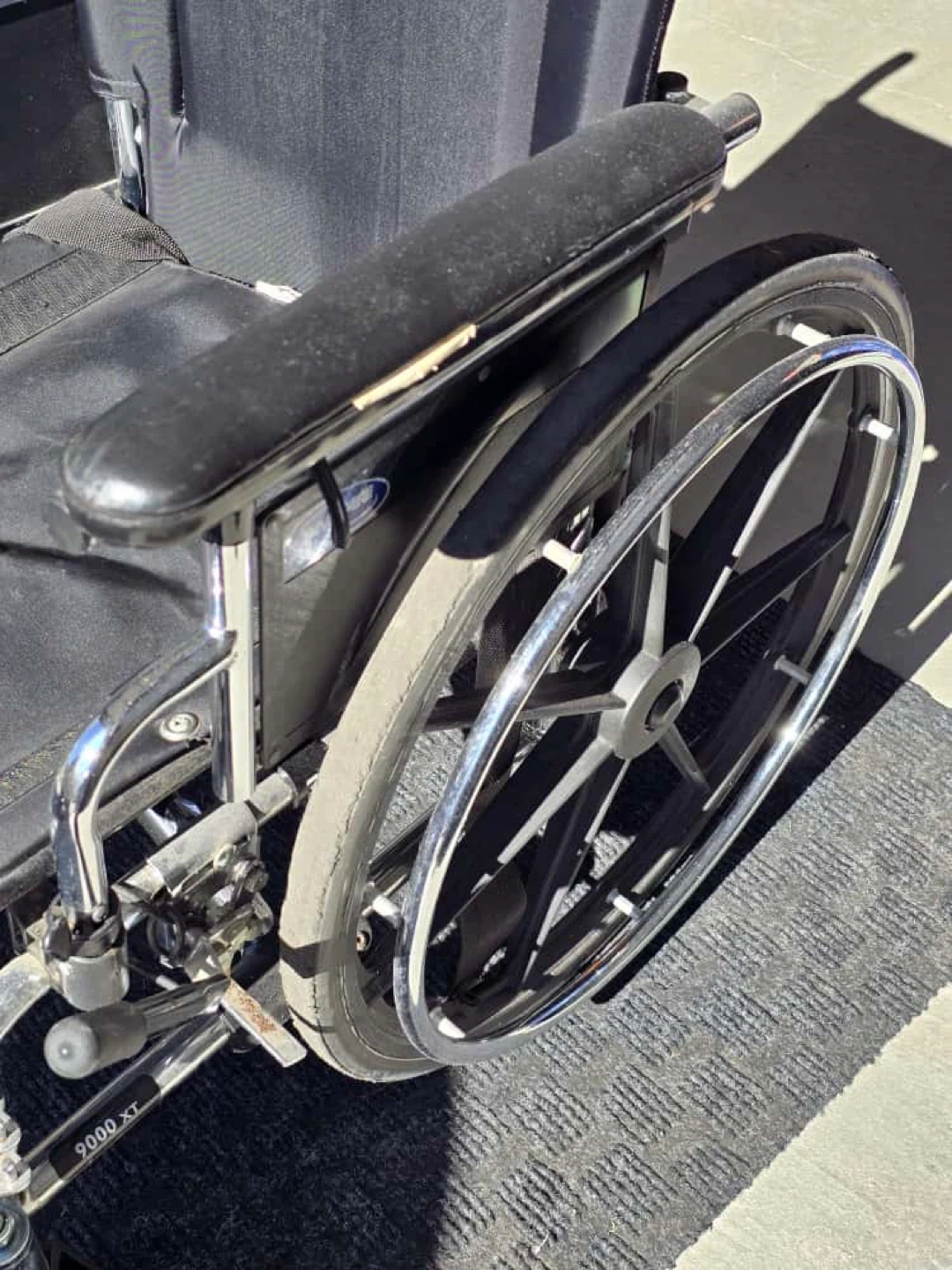Selling an Invacare 9000 XT wheelchair. It features a black seat and back, with a chrome frame. It's in fairly used condition but still functional.