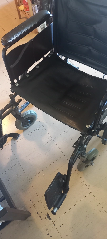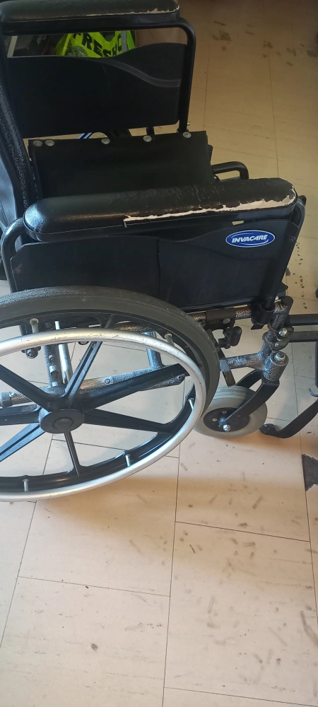 Selling an Invacare wheelchair. It's in gently used condition and ready for a new home. Perfect for someone needing a reliable and comfortable mobility solution. The wheelchair has a black seat and backrest.
